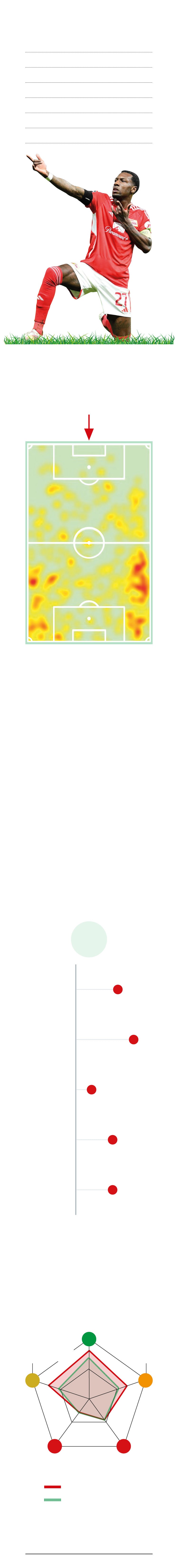 En amarillo las zonas en las que se situó el jugador durante esta temporada y en naranja y rojo las zonas con una mayor presencia suya