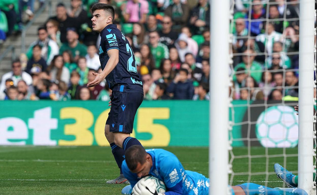 Disparo de Mikel Merino desde el centro del campo que acaba en el larguero de la portería del Betis: