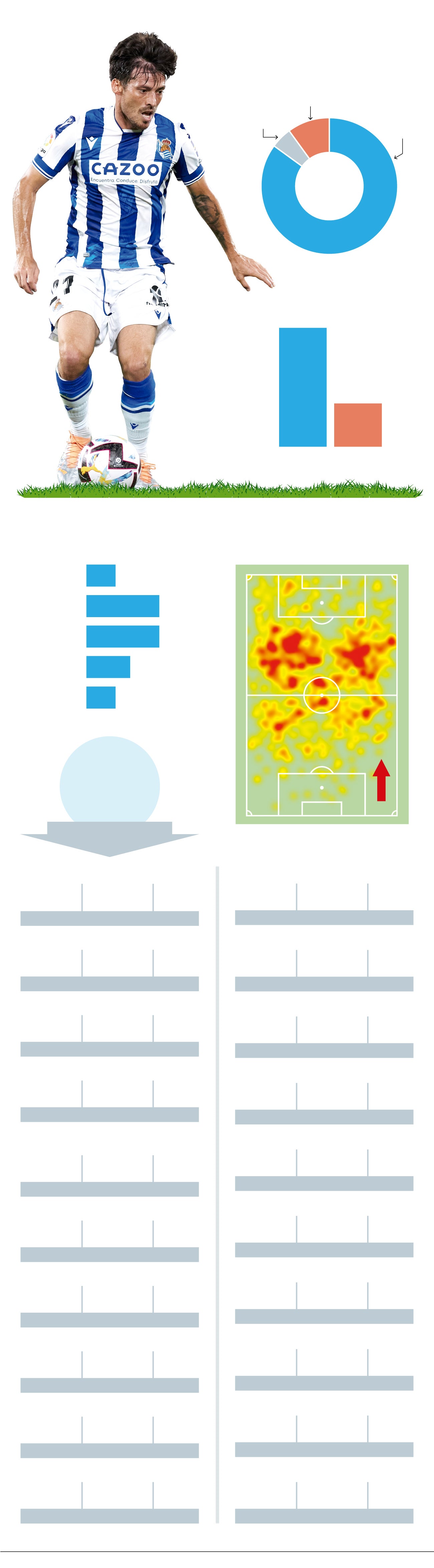 Pocas veces en su historia el club ha tenido un jugador con tanto peso en el ataque. Y es que sus números son bestiales. Cuando está en el terreno de juego cualquier cosa puede pasar. En los 33 tantos anotados por la Real con él jugando ha participado en 17, lo que representa un 51%. Sus acciones se reparten en dos goles, dos penaltis provocados, cuatro asistencias, cinco penúltimos pases y cuatro intervenciones previas en la jugada.