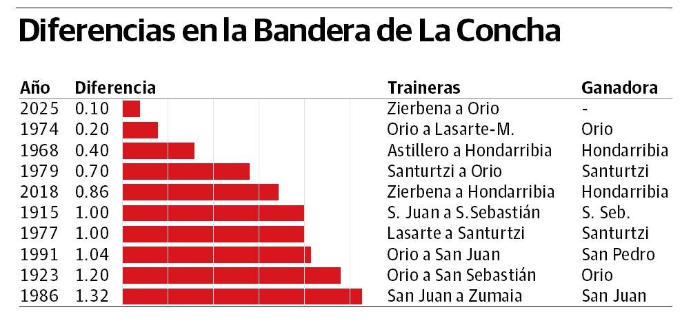 Se tarda más en lanzar un suspiro que esas diez centésimas que Zierbena tiene sobre Orio de cara a la segunda jornada de la ... Bandera de La Concha. Es la diferencia más pequeña en los 146 años de historia de la competición y si ya de por sí apenas otorgan ventaja alguna, el domingo menos aún si se cumplen las previsiones y las olas rondan los dos metros de altura.