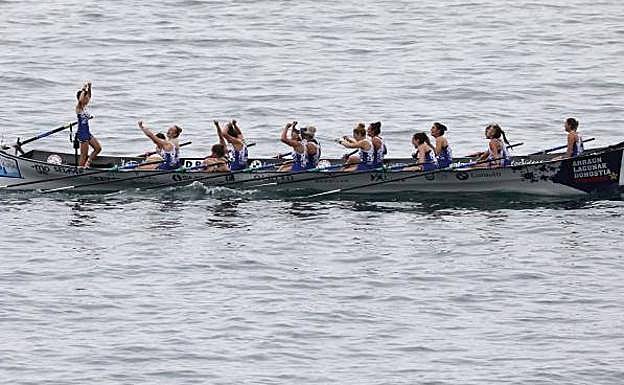 El mejor tiempo de la primera tanda de Orio lo superaron a mitad del segundo largo ambas embarcaciones y la lucha se centró en Hondarribia y Donostiarra. Los verdes, con una remada larga de 35 paladas por minuto, consiguieron salir de la segunda ciaboga a seis segundos, pero las corrientes entraron en juego y los donostiarras, en apenas un minuto, cogieron la proa.