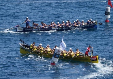 Cuando Gorka Aranberri apretó el acelerador a fondo y el descomunal motor de los amarillos se puso a pleno rendimiento, no hubo manera de seguirle. El depósito de la 'San Nikolas' contaba todavía con combustible para permitirse ese extra, mientras que en el salpicadero rival se encendía el piloto rojo de reserva. Ambos botes disputaron la tanda de honor por los extremos del campo de regatas -Donostiarra por la calle uno y Orio por la cuatro- y se quedaron solos en cabeza bien pronto. Tanto Zierbena, por la baliza tres, como Hondarribia, por la dos, comenzaron a perder comba mediado el largo inicial. Imposible seguir el ritmo de los de la dupla de cabeza con la corriente en contra -la marea estaba subiendo- y el viento también de proa.