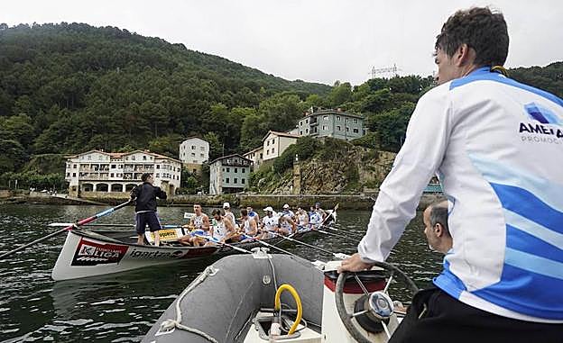 Con la Torrekua II ya en el agua, el entrenador de Donostiarra da las últimas instrucciones al patrón, Arkaitz Díaz, sobre las series a realizar. El inicio, lógicamente, es suave, a 18 paladas. «¡No rebotar! ¡Espalda atrás!», grita desde la motora. Poco a poco el ritmo se va incrementando con series a 32-33 paladas. «¡Brillo y claridad!, ¡brillo y claridad!», insiste. «¡Sujeto posición en popa y proa! ¡Cadera y pierna!».
