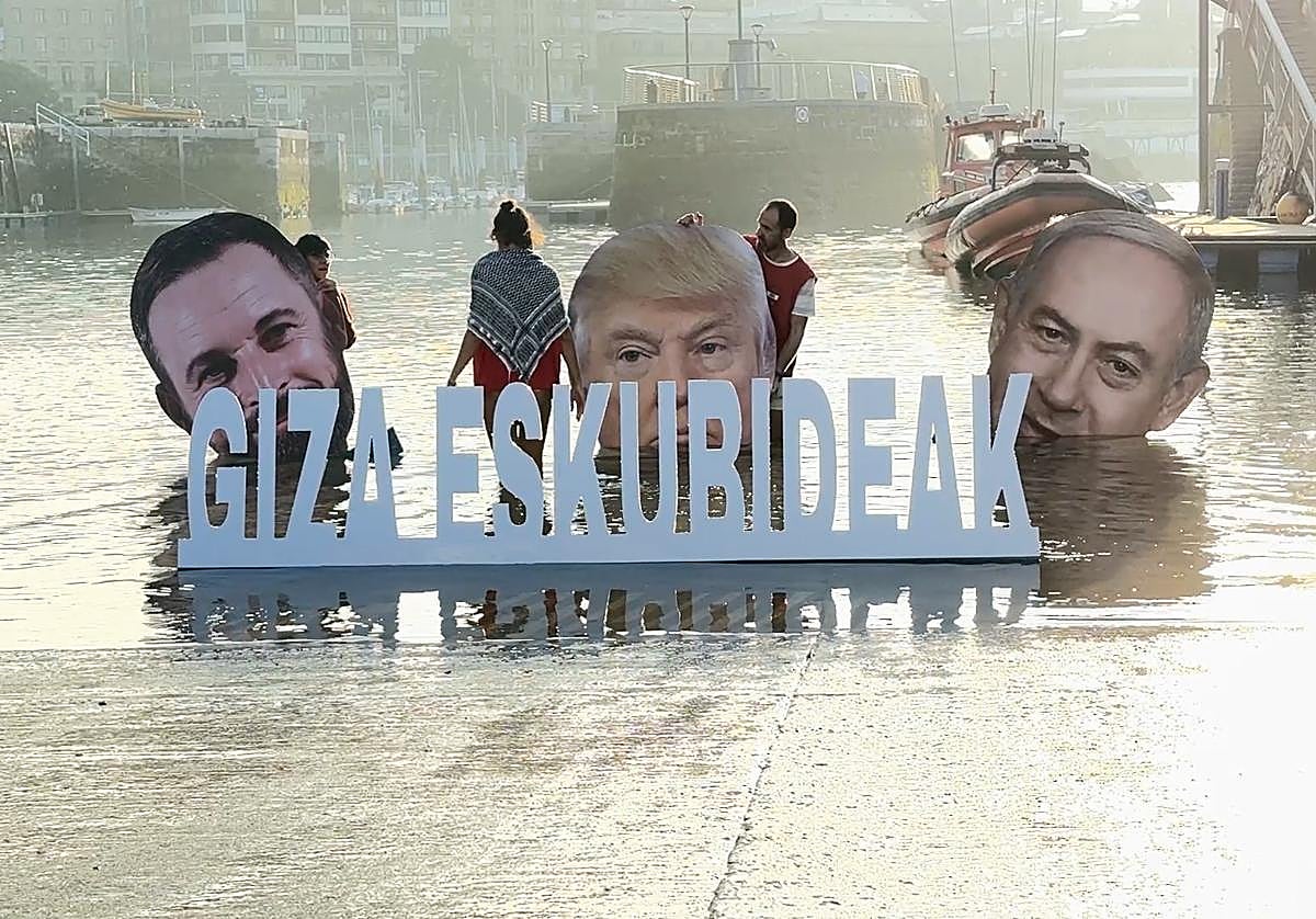 La plataforma 'Pobreza Cero' de Donostia ha hundido las cabezas de los tres dirigentes en el muelle donostiarra como protesta frente al auge de la extrema de recha y la vulneración de los derechos humanos