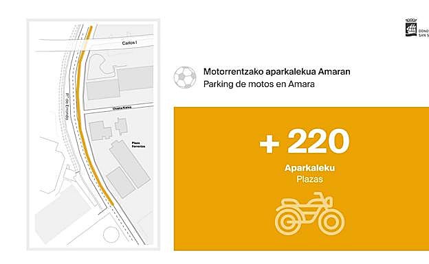 Tras analizar muchos espacios en el entorno de Amara y Anoeta parece que el Ayuntamiento ha encontrado el lugar apropiado para situar el parking de ... motos a utilizar los días que haya partido de la Real o que se celebren otros eventos multitudinarios en esa zona polideportiva. El lugar elegido por el consistorio, y que cuenta con el beneplácito del Real Moto Club de Gipuzkoa, tal y confirmó ayer la concejala de Movilidad Pilar Arana, estará situado en el paseo de Errondo, concretamente entre el colegio público Amara Berri y la zona bajo los tableros de Carlos I (la que está debajo de la autopista de entrada a la ciudad) dirección Morlans. En este espacio, y solo los días de partido, podrán aparcar al menos 220 motos en línea junto a la mediana que separa los dos sentidos de circulación del paseo. Esta es la opción presentada por el consistorio como alternativa al antiguo parking de motos que estaba situado entre Anoeta y el polideportivo Josean Gasca, cerrado desde antes de la pandemia por razones de seguridad.