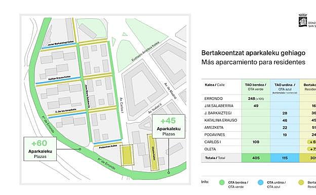 Una vez analizado el entorno, el Ayuntamiento ha adoptado la decisión de crear, en la misma zona de Errondo en la que se situará el parking de motos, 45 nuevas plazas de aparcamiento de OTA y residentes en línea junto a la mediana del paseo de Errondo entre el colegio Amara Berri y Carlos I. Para ello, el consistorio deberá eliminar uno de los carriles de circulación y realizar una intervención que posibilite crear una pequeña acera junto a la mediana que permita abandonar la zona con seguridad a quienes aparquen en dicho lugar tanto para pasar a Amara como para acudir a la zona polideportiva. Es decir, en esa zona concreta habrá 45 nuevas plazas de aparcamiento para coches que tendrán que los días de partido deberán dejar el espacio libre para que entren al menos 220 motos. Además, las 90 plazas de aparcamiento en linea de OTA situadas en el paseo de Errondo entre los tableros de la Variante y la rotonda de Morlans pasarán a ser 150 plazas para aparcar en batería. Por lo que en todo el paseo de Errondo se ganarán tras las obras pertinentes 105 nuevas plazas de estacionamiento de OTA y residentes.