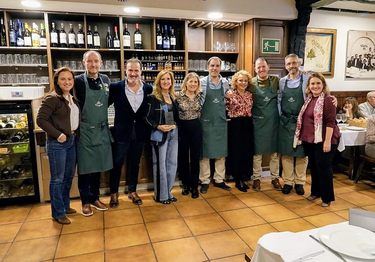 La sociedad Gizartea celebró una comida-maridaje con un excelente menú y vinos de la Bodega Familia Valdelana de Elciego, Rioja alavesa. Varios eran los invitados que habían acudido para la exposición de los datos de la bodega. En primer lugar Juan Jesús Valdelana, propietario y enólogo, decimo segunda generación de esta familia. Valdelana es la bodega con más viñedos singulares de la Rioja, hasta 11, de los que 6 están cualificados. Le acompañaba su esposa Inma Villuendas. Junto a ellos Raúl Espinosa, responsable comercial y Pedro Balerdi, representando a la distribuidora Sein Izarra, acompañado de Lourdes Mayo. Varias de las parejas de los miembros de la directiva, Elena Garbizu, Leticia Seco y Jaione Otaegui, fueron las encargadas de hacer entrega de los delantales e insignias de Gizartea a los invitados. Juanje Valdelana también recibió la pieza corporativa de madera y acero de la sociedad que se entrega a las empresas colaboradoras.