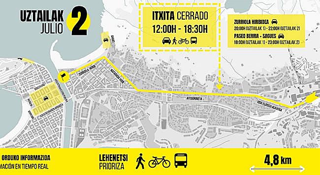 La avenida Zurriola se cerrará también el sábado 1 de julio a las 20.00 horas para el montaje del arco de meta y de la zona del podio, mientras que el recorrido de 4,8 kilómetros que el pelotón realizará desde la entrada a la ciudad desde el este hasta la Zurriola estará cerrado desde las 12.00 horas del domingo 2 de julio hasta aproximadamente las 18.30 horas del mismo día.