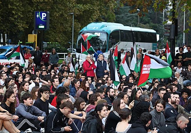 Cientos de personas cortan la entrada a San Sebastián con una sentada en favor de Palestina
