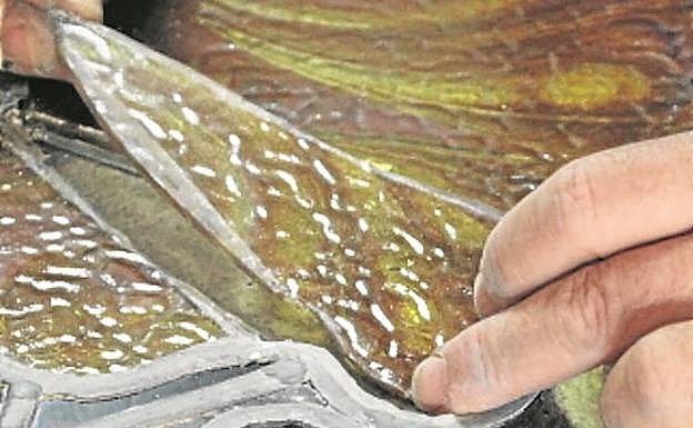 Pero hay otra tarea casi más fundamental todavía: arreglar las vergas de plomo donde van encajadas las vidrieras. «El paso del tiempo hace que acaben cediendo. Se trata de vergas de plomo. Algunas vidrieras ha habido que desarmarlas y emplomarlas de nuevo», cuenta este profesional, que define su trabajo como algo «delicado y minucioso», sobre todo cuando toca volver a colocarlas en su sitio. A ojos inexpertos puede que apenas se note la diferencia pero la labor realizada «consigue que una pieza se mantenga en su sitio, sin que se desmorone, pero sin que se note la presencia de ese plomo».