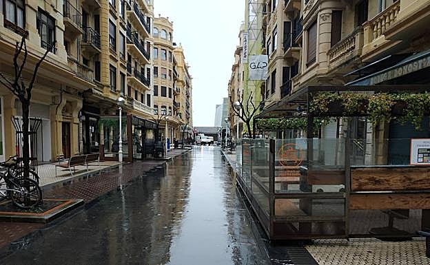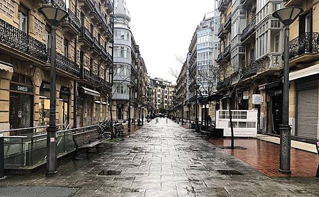 Las calles peatonales del centro de San Sebastián con gran número de bares y terrazas permanecen desiertas. Ejemplo: la calle Reyes Cotólicos.