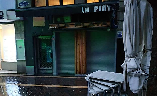 Los bares, como el de 'La Plata' de Gros, amanecen con las persianas bajadas en un día muy lluvioso.