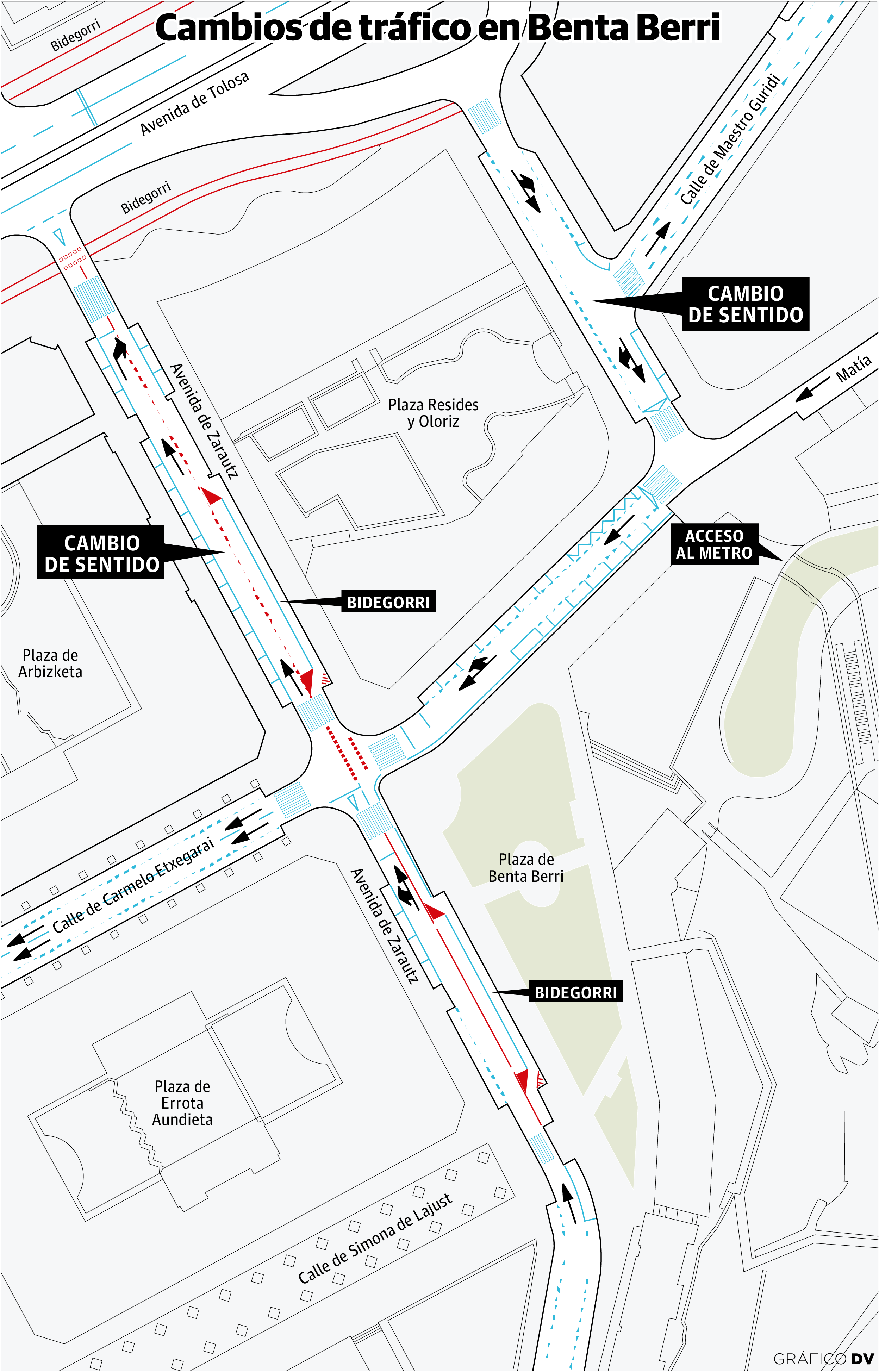 La conexión con la avenida de Tolosa/Zumalacárregui se realizará a partir de ahora mediante un cambio en la dirección de la última manzana de la avenida de Zarautz (la de los cines Benta Berri) que ahora será de bajada. Este cambio no solo permitirá embocar en la avenida de Tolosa a los conductores de la avenida de Zarautz, sino a los que discurran por la calle Matía, que ya no podrán bajar por la calle Benta Berri, ya que esta vía también cambiará de sentido y ahora será de subida en vez de bajada.
