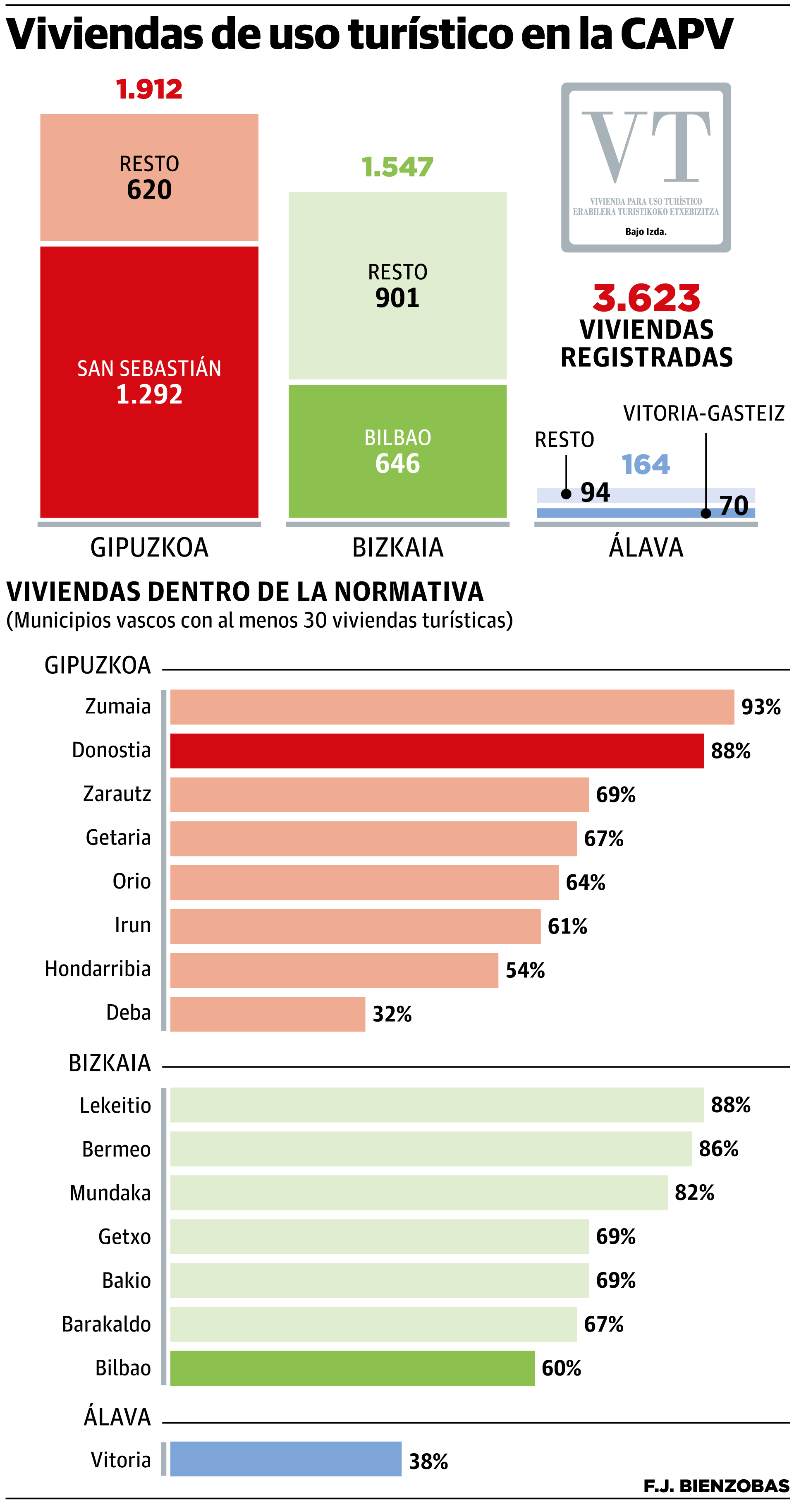 El dato surge de la comparación hecha por esta organización entre el número de viviendas registradas oficialmente y el de comercializadas en los portales especializados, como Airbnb, en los 16 municipios vascos que ofrecen un mínimo de 30 viviendas turísticas. El 88% de cumplimiento íntegro de la normativa en San Sebastián contrasta con el 60% de Bilbao o el 38% de Vitoria, siempre según Aparture. Datos que reflejan que el alquiler alegal es hoy mayor en el resto de capitales vascas que en la guipuzcoana.