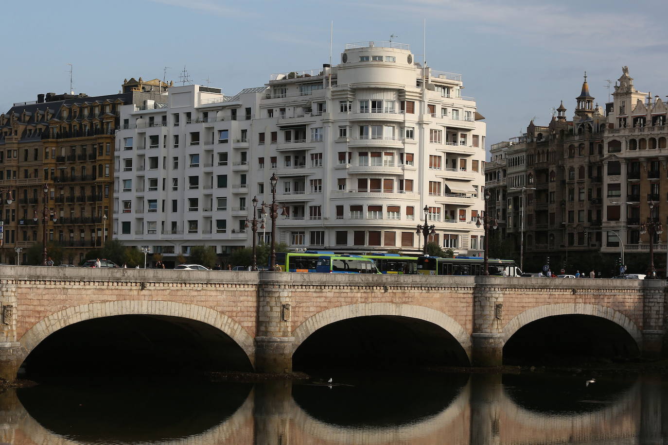 Plaza Euskadi 1. Proyecto de Fernando Arzadún Ibarraran. El emplazamiento, la formalización expresionista y el color blanco de su fachada confieren a este edificio un especial protagonismo urbano. La composición pretende subrayar la importancia de la esquina que se enfrenta al río. Arzadun centró su esfuerzo en la composición de la fachada mediante dos mecanismos: por un lado, el contraste entre las líneas horizontales de los balcones y las verticales de las pilastras y sus antenas, y por otro, el juego entre volúmenes salientes y vacíos entrantes, que hacen difícil identificar una alineación de la fachada.