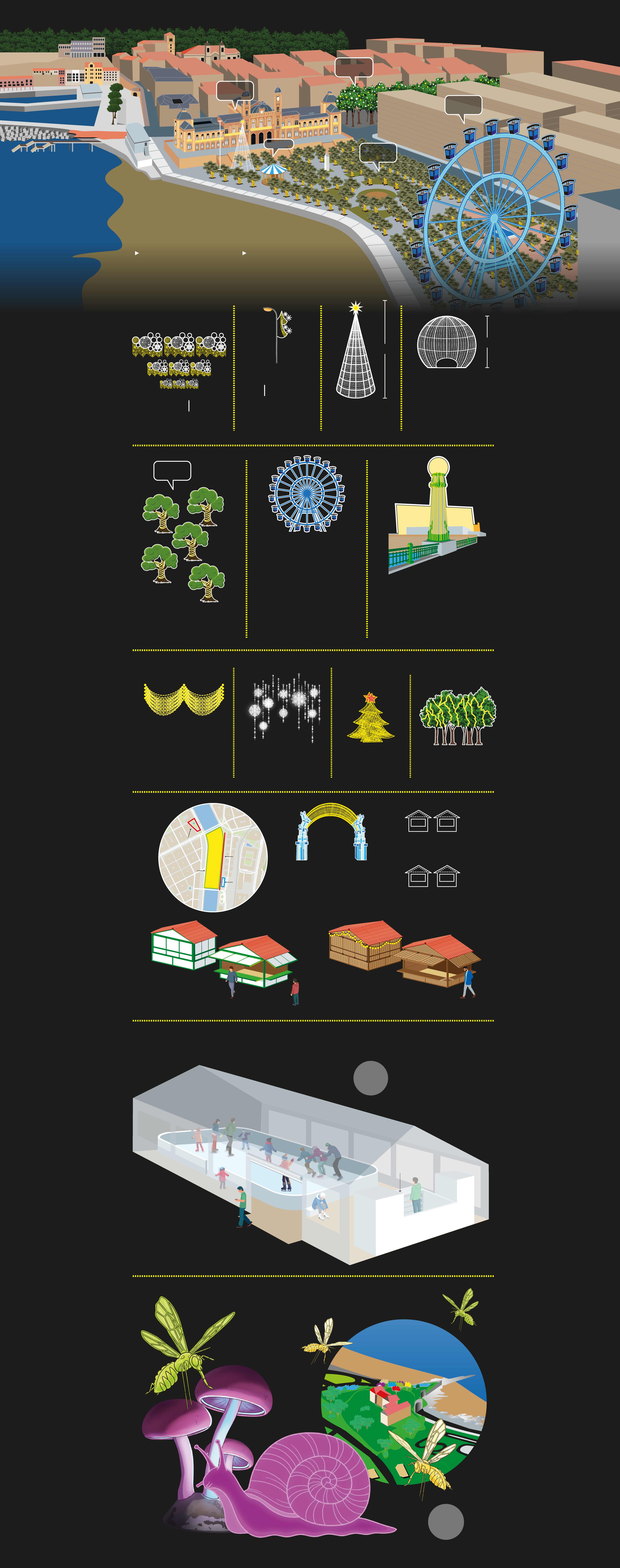 Solo en Donostia, cerca de 600 elementos luminosos decorarán más de un centenar de calles hasta el próximo 6 de enero, de Igeldo a Altza y de la Parte Vieja a Martutene. En total, 169 arcos, 181 motivos luminosos en farolas, 227 árboles decorados y cinco elementos de suelo darán forma a una iluminación elegante que combina diseño y eficiencia energética. Tampoco falta el ya habitual de estos últimos años mercado navideño situado entre el paseo del Urumea y la plaza Ramón Labayen con 71 casetas que atienden en un horario de 11.30 a 14.00 y de 16.30 a 20.00 horas. Aunque la gran novedad de la campaña navideña en la capital guipuzcoana este año es la pista de hielo situada frente a la entrada a la estación del Norte.