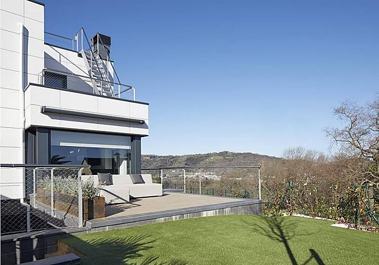 La primera de estas viviendas es un pequeño chalet de ocho habitaciones y dos baños repartidos en 223 metros cuadrados y dos plantas comunicadas con un ascensor interno. Cuenta con piscina interior, jardín, terraza y vistas despejadas hacia el monte Igeldo ya que está ubicada en Atotxa Erreka por lo que se recomienda alquilar un coche para llegar cómodamente hasta ella.
