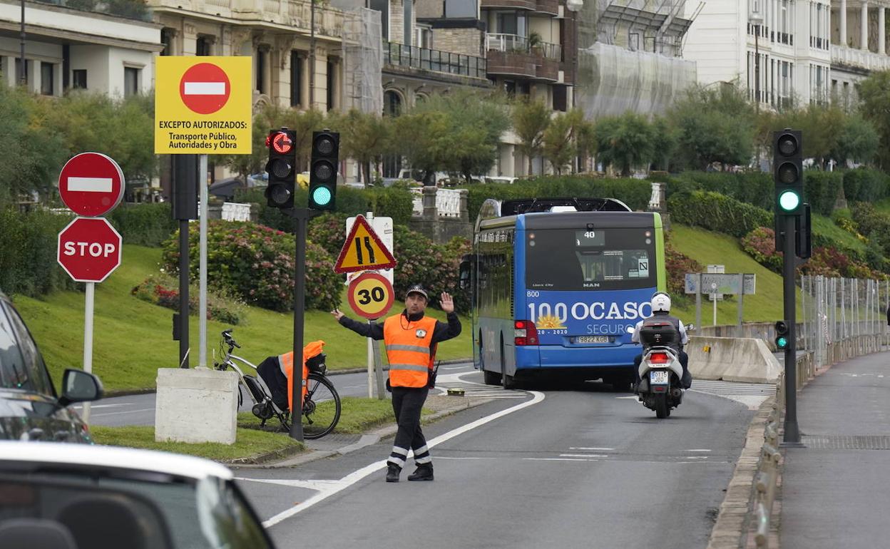 Trabajadores de la constructora Moyua, empresa encargada de la gestión de las obras en la zona, aguardaban en el paso de cebra a la altura de Miraconcha el momento en el que los agentes de tráfico comenzaran a desviar a los vehículos. A las 9.40 horas se ha descubierto finalmente la señal que indica el cierre del paseo de La Concha «excepto a autorizados: transporte público, autoridades y obra».