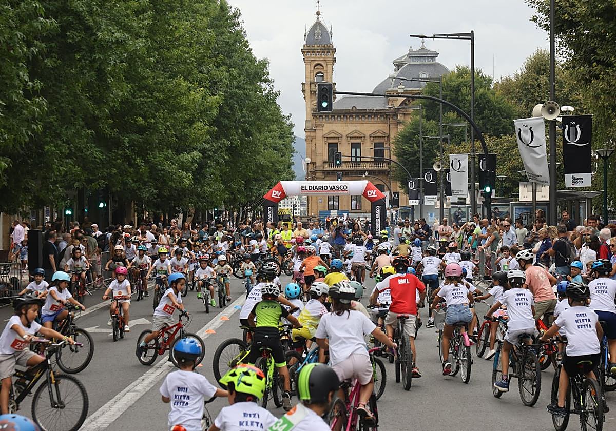 No hay Pogacar, Vingegaard o Evenepoel que les haga sombra. Los más pequeños de la casa aún tienen mucho que decir ante el empuje de ... las grandes figuras del ciclismo mundial, que hace apenas unos días visitaron la ciudad con el paso de la Clásica. Y es que en la tarde de este martes, el Boulevard fue testigo de la valía de casi 300 pequeños sobre la bici en la Bizikleta Festa, uno de los clásicos de la Semana Grande donostiarra. Algunos a cuatro ruedines, otros a dos, y los más pequeños ayudándose con los pies, los ciclistas más txikis tomaron la calle luciendo los cascos más originales y coloridos: desde protectores de unicornios hasta de dinosaurios.