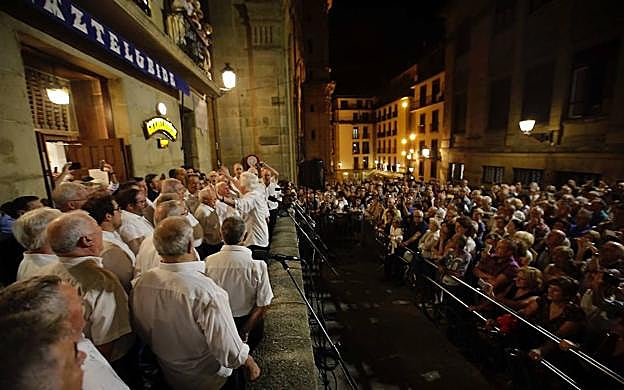 Sara Santos A las 23.45 horas cuatro coros en cuatro localizaciones amenizarán la noche donostiarra. Las voces de Coro de Gaztelubide (plaza Virgen del Coro), Coro Goratzar (parque Aitzol), Coro Luberri (plaza Gaskuña) y Coros del Easo (plaza Cataluña) se escucharán por toda la ciudad.