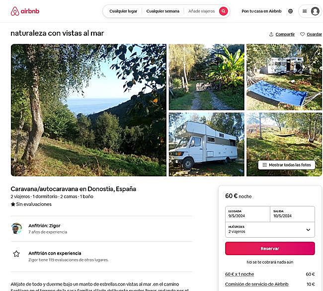 «Aléjate de todo y duerme bajo un manto de estrellas con vistas al mar, en el camino de Santiago, en el terreno de la casa familiar, al lado del huerto», señala el anuncio de este 'establecimiento' ubicado en algún punto no concretado del monte Igeldo, a medio camino entre Donostia ye Orio. Las fotos muestran un bonito paisaje verde con vistas al mar Cantábrico, además de la caravana en cuestión y una hamaca colgada de dos árboles.