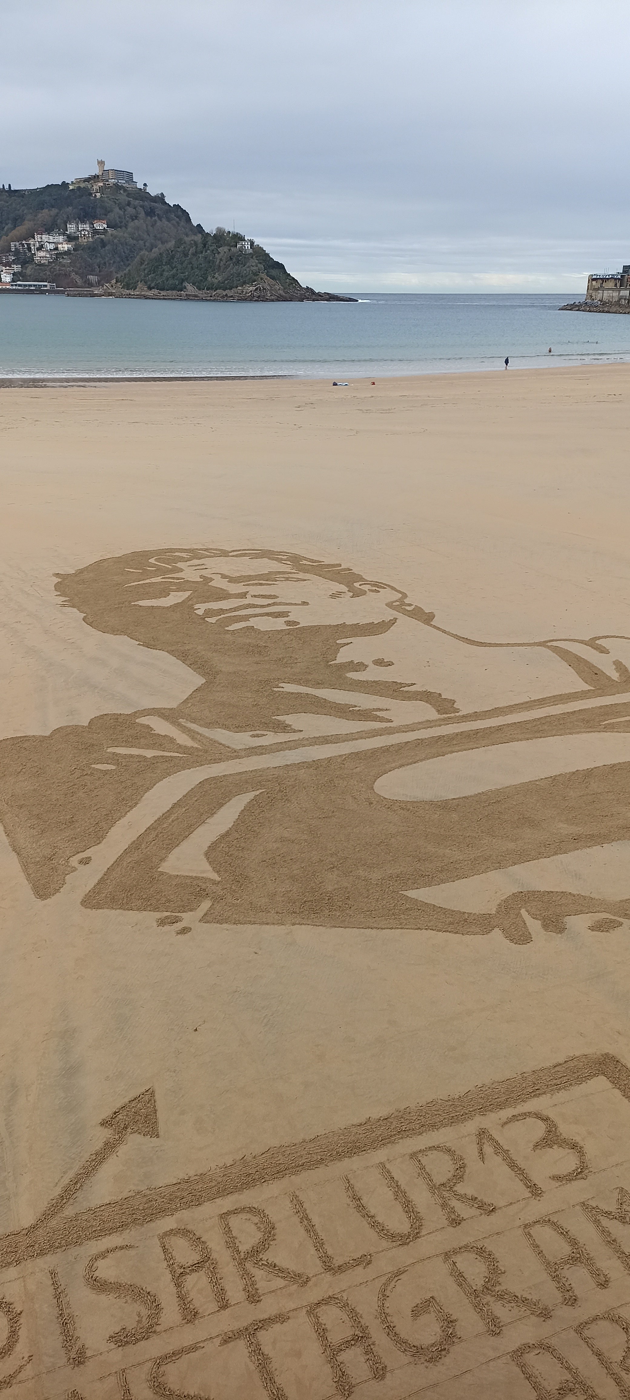 La playa de La Concha suele ser un improvisado lienzo para diferentes artistas que trabajan sus obras en la arena. Hace un mes, apareció una imagen de Santoshi Tudu. La ONGD Calcuta Ondoan, con el apoyo del Ayuntamiento de Donostia, quiso celebrar de una forma muy especial los 25 años que lleva apoyando proyectos en desarrollo en la India, así como todo tipo de actividades de Educación para la Transformación Social en nuestro entorno. El autor, en este caso, fue Germán Cedano Mongrut.