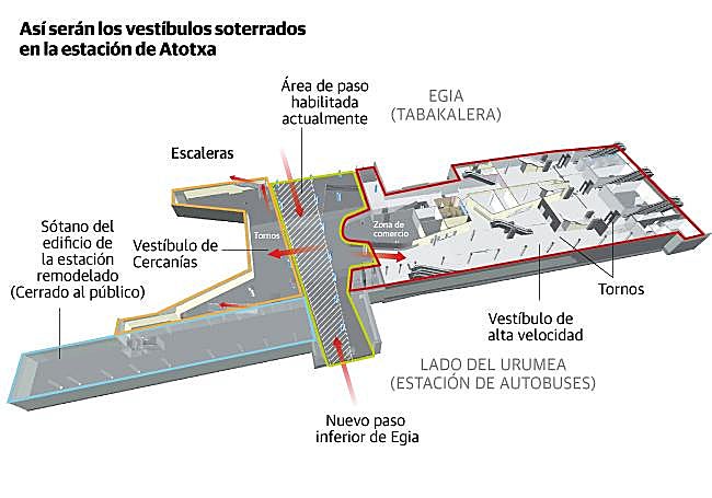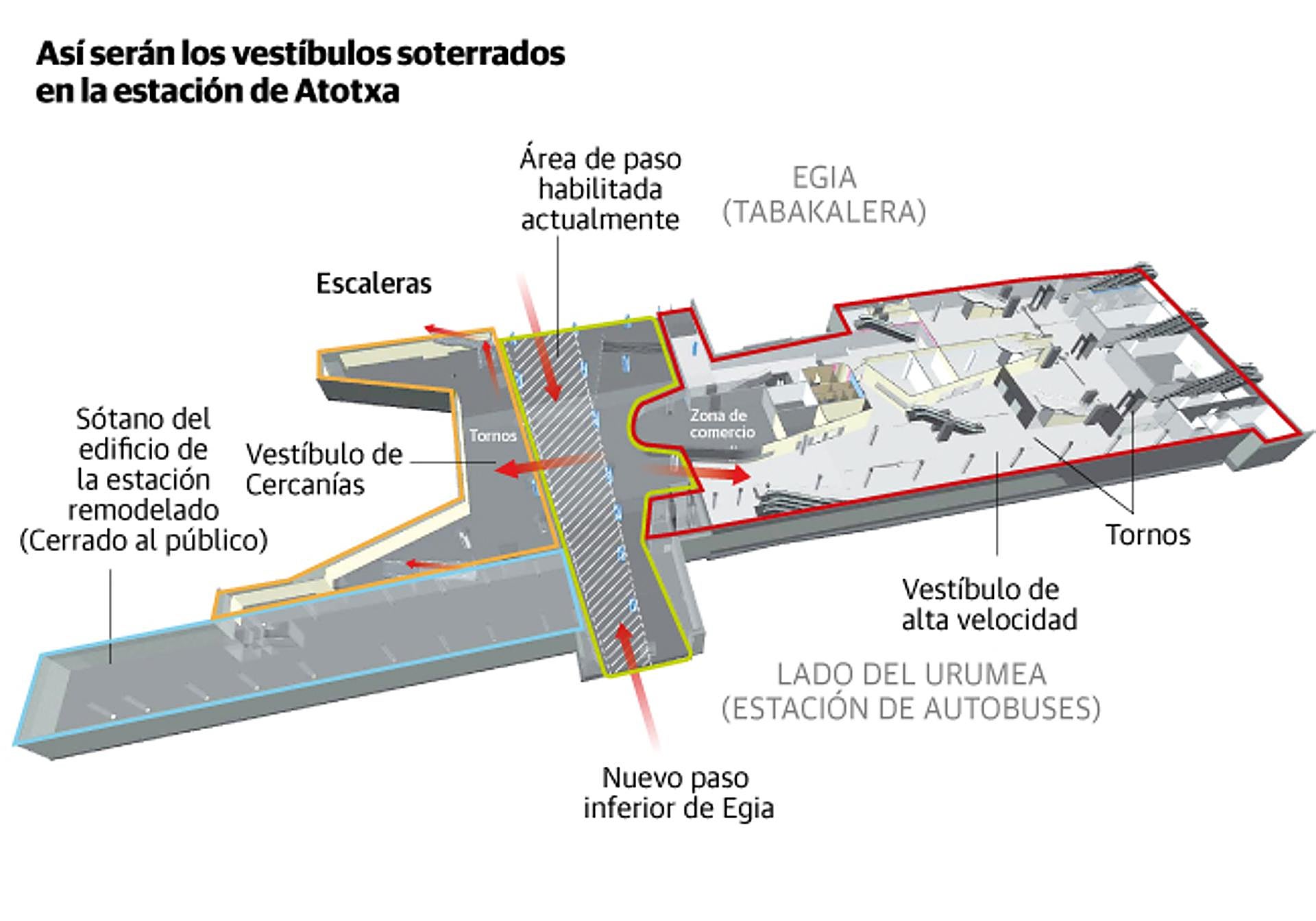 Los dos vestíbulos soterrados que se están terminando de construir bajo la playa de vías contarán con 7.400 metros cuadrados para distribuir a los viajeros entre los trenes de Cercanías, Media y Larga Distancia –bajando por el pasadizo de Egia desde el lado del río, a la izquierda– y los de alta velocidad –accediendo al pasadizo también desde el río, a la derecha –. A estos vestíbulos subterráneos se podrá llegar, además de por el pasadizo de Egia, desde el edificio de la estación a través de escaleras y ascensores.