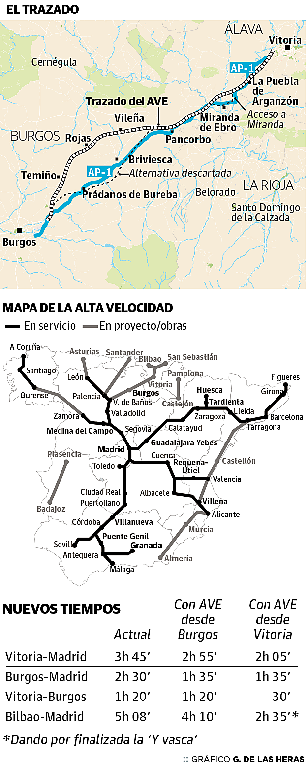 El trazado. Con 93,3 kilómetros en total, se divide en dos subtramos. El primero, de Burgos a Pancorbo (55,7 kilómetros), da un rodeo por el oeste, en La Bureba. El segundo (37,6 kilómetros) cruza Pancorbo, Miranda y La Puebla hasta Vitoria.