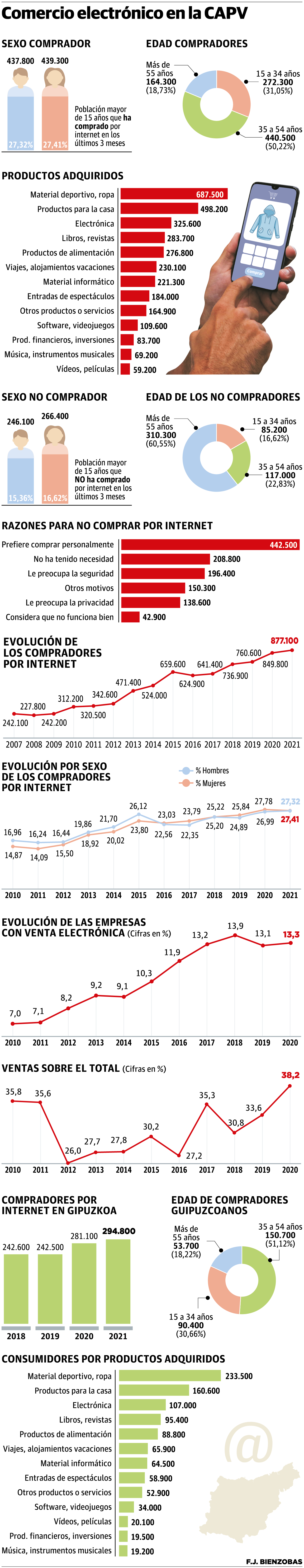 Los nuevos hábitos de consumo han llegado para quedarse y las empresas vascas pisan el acelerador para subirse al tren del comercio electrónico. La tendencia ... a las compras 'online' sigue en aumento en Euskadi y cada vez es mayor el número de usuarios que opta por este canal para adquirir productos y servicios. Según datos del Observatorio de Comercio de Euskadi, Enfokamer, cuatro de cada diez guipuzcoanos (el 41%) realizó compras 'online' en el último año, un aumento que se viene observando desde 2018, con un incremento del 17,7% de los consumidores por internet, pasando de los 242.600 ese año a los 294.800 compradores en 2021.