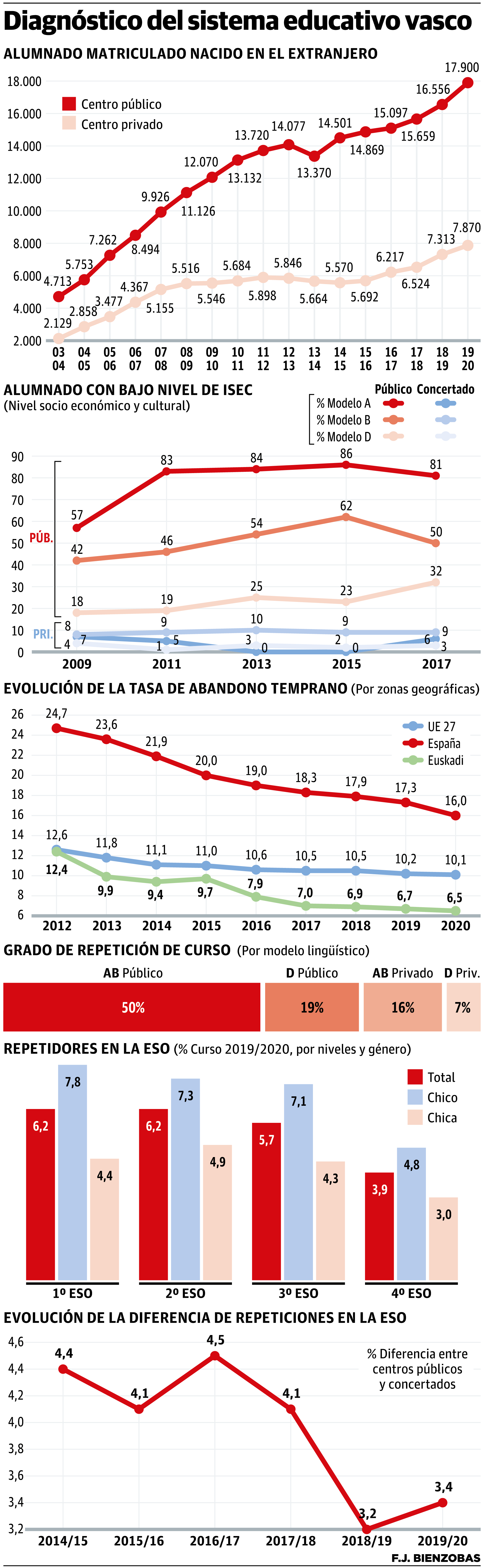 La evolución demográfica en la sociedad vasca tiene su reflejo en las aulas. Y dentro de ellas se ven notables diferencias entre la red pública ... y la concertada en cuanto al éxito escolar de sus estudiantes. Ambos sistemas no escapan de sus propias realidades y hacen de espejo de la sociedad. Así, el estudio 'Evolución sociodemográfica del alumnado en Euskadi' de Silván and Miracle constata que en los colegios públicos la tasa de repetición es mayor que en la red concertada. En concreto en los modelos A y B de los centros públicos, uno de cada dos alumnos ha repetido al menos un curso. A ellos se suma el 19% de los matriculados en el modelo D. Los porcentajes de repetidores en la red privada son mucho menores, en el modelo A y B han tenido que volver a hacer el curso un 16% de sus alumnos, baja al 7% si se trata del modelo D.