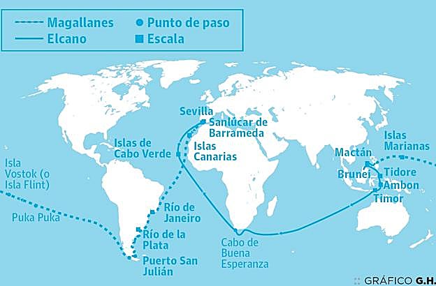 Todos reivindican el papel de Juan Sebastián Elcano en esta gesta, frente al protagonismo que la historia le ha dado al jefe de la expedición. «Magallanes está sobrevalorado. Fracasó, porque nunca llegó a las Molucas, y se metió en una batalla que puso en riesgo la misión, que no era dar la vuelta al mundo, sino traer especias. Queremos recuperar una página brillante de la historia. La gesta, el dinero y los tripulantes eran españoles», recuerda José María Morales de Oñate. «La idea de dar la vuelta al mundo no estaba prevista; fue de Elcano -apostilla el capitán-. El marino de Getaria era consciente de que los vientos en el Pacífico no eran favorables para volver hacia el Este y decidió regresar por el Oeste, por la ruta de los portugueses, a sabiendas de que el rey Manuel había dado órdenes a sus ejércitos de hundir la flota española y matar a sus tripulantes». «Lo que no se conoce no se quiere, y en España la historia no se conoce. La leyenda negra sobre los españoles son las 'fake news' de la época», lamenta Diego Fernández.