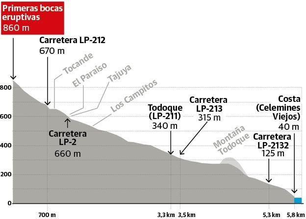 Las primeras bocas partían de las dos fisuras originarias, separadas por 200 metros. A las nueve en esa misma zona se añadió una en las proximidades de Tacande.