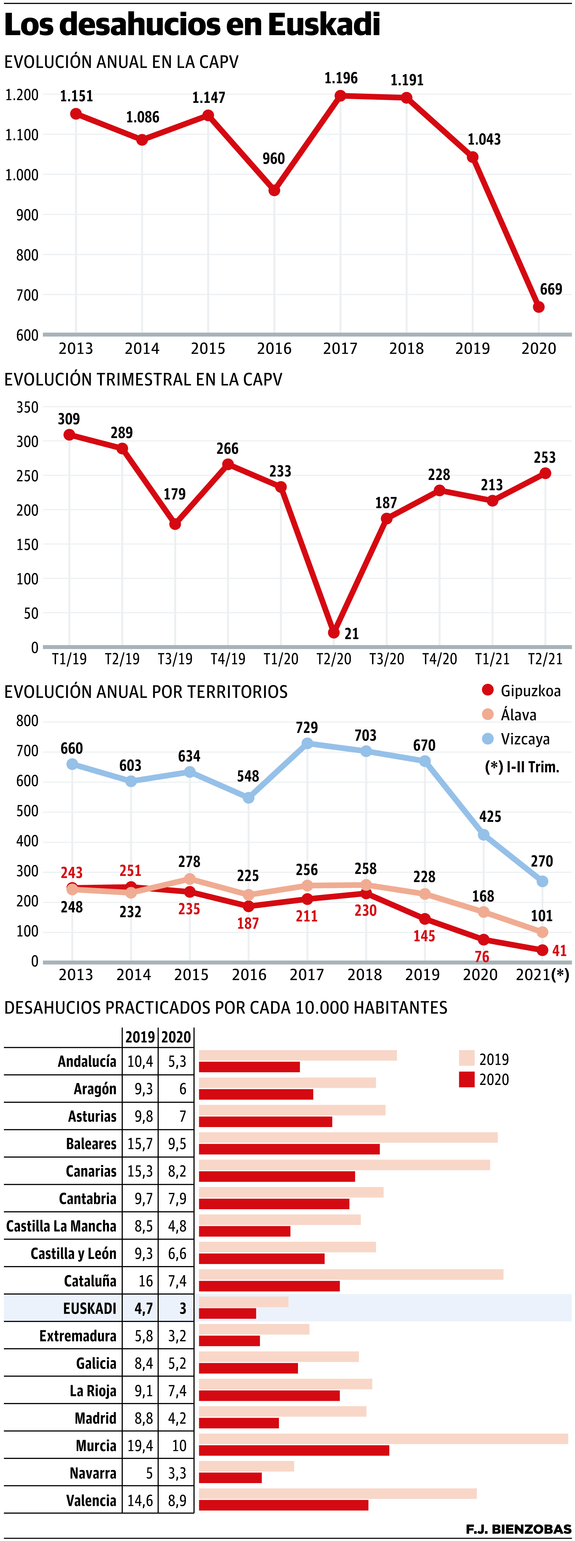 El regreso a la normalidad pospandémica ha traído consigo también la vuelta a la normalidad en el número de desahucios practicados antes de que la ... paralización de muchos sectores económicos, y con ella la falta de ingresos en miles de familias, forzara al Gobierno central a suspenderlos durante el primer trimestre de irrupción de la pandemia. El final de ese paréntesis entre abril y junio de 2020 en las ejecuciones hipotecarias y los lanzamientos por impago del alquiler volvió a reproducir los casos hasta regresar a cifras de 2019, aunque, al igual que en los últimos ocho años, Euskadi sigue a la cola de las comunidades en este ranking de desahucios, incómodo para los gobiernos y dramático para las familias.
