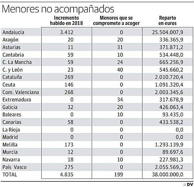 Dos casos particulares son los de Extremadura, que no ha recibido a ningún menor, pero cuenta con 317.678 euros de ayudas porque ha sido solidaria y se ha comprometido a acoger 34 'menas'; y las Islas Baleares, que tampoco ha registrado la llegada de más 'menas' en 2018, pero que se ha ofrecido a acoger a diez menores y obtendrá 93.435 euros.