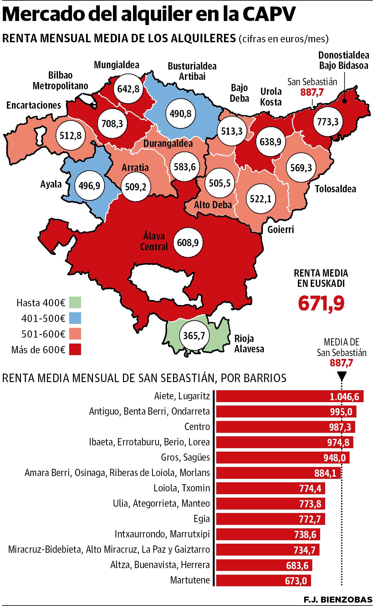 La futura ley estatal, recientemente aprobada en Consejo de Ministros para poner tope a los alquileres en zonas tensionadas y a grandes tenedores de vivienda –un fenómeno menos habitual en Euskadi–, además de aplicar recargos a viviendas vacías o impulsar ayudas a la emancipación de jóvenes, bebe de políticas ya en marcha en Euskadi, a raíz de la Ley de Vivienda de 2015, que sigue en desarrollo. Pero sirve también aquí para reactivar, visto que el incremento de precios del alquiler continúa imparable, el debate sobre más medidas puede o debe adoptar la Administración pública para frenar la escalada. La última Encuesta sobre Oferta Inmobiliaria de Euskadi con datos del segundo trimestre de este año situaba los alquileres en precios récord, 1.049 euros de media en Euskadi y 1.138 euros en Gipuzkoa, un 2,1% y un 3,7% más que un año antes. Y ese repunte, que en este territorio rompía la tendencia de los dos años anteriores, se notará también en las rentas establecidas en los contratos de arrendamiento firmados, en los que se basa la EMA. Son estas últimas cifras, por debajo de las mencionadas, las que servirán de referencia para esta nueva política en ciernes sobre el alquiler. Se trata de las rentas fijadas en los contratos entre propietarios e inquilinos, no los precios ofertados de salida. Una fotografía más ajustada, a juicio del Departamento de Vivienda, sobre cuánto se paga realmente en cada zona.