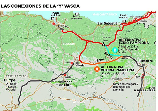 El enlace hacia Navarra es relevante para la 'Y' vasca porque supondría abrir la puerta a la conexión con Zaragoza, Barcelona y los puertos del Mediterráneo. Durante los últimos veinte años, el proyecto se ha redibujado en tres ocasiones. La última en 2018, cuando el entonces titular de la cartera de Fomento, Íñigo de la Serna, del PP, puso sobre la mesa los planes que siguen vigentes.