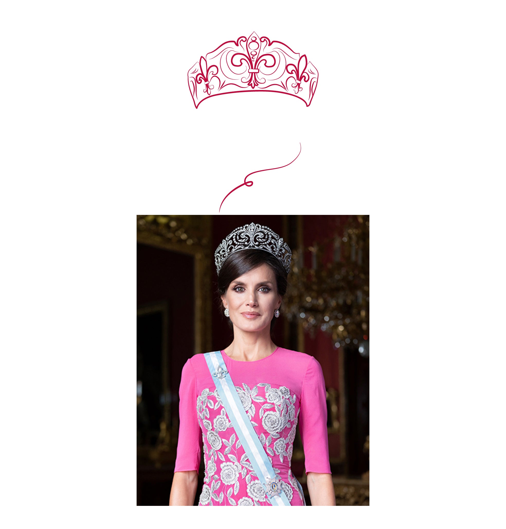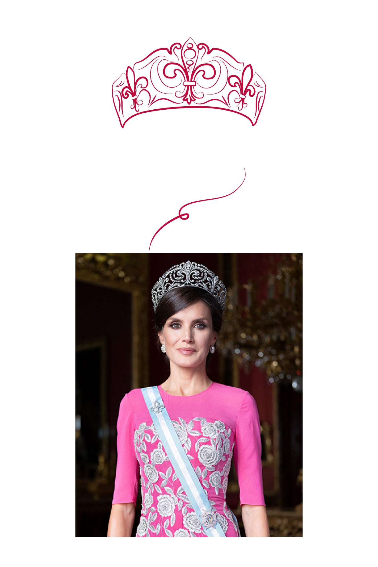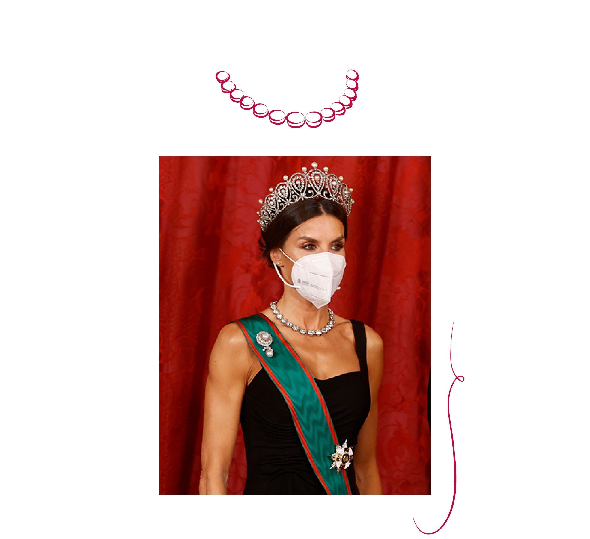 Viene a ser la gran corona de la que carece la monarquía española. Es la pieza más representativa del joyero de los borbones. Firmada por la casa Ansorena, fue un regalo de Alfonso XIII a su entonces prometida y fue la tiara que usó Victoria Eugenia para su boda en 1906. La reina Sofía la reservó para las grandes ocasiones; doña Letizia, también. La 'estrenó' en febrero de 2017, en la cena en honor del presidente argentino, Mauricio Macri, y su mujer, Juliana Awada, en el Palacio Real. Y la ha lucido también en varios de sus viajes de Estado: Japón, Reino Unido, Suecia...