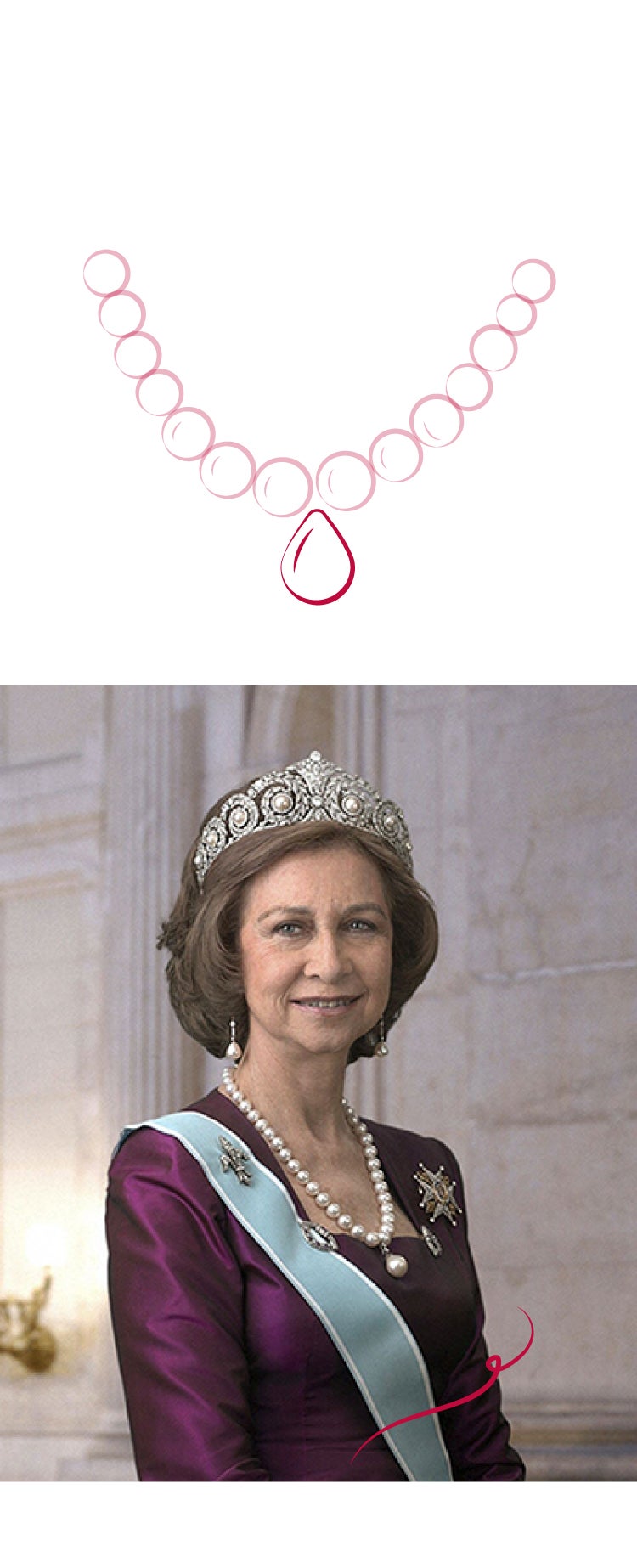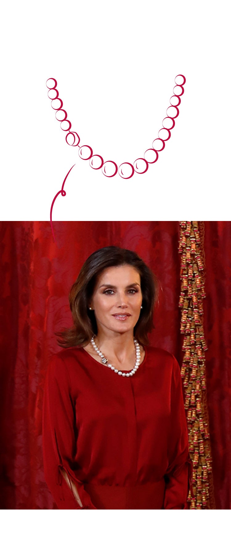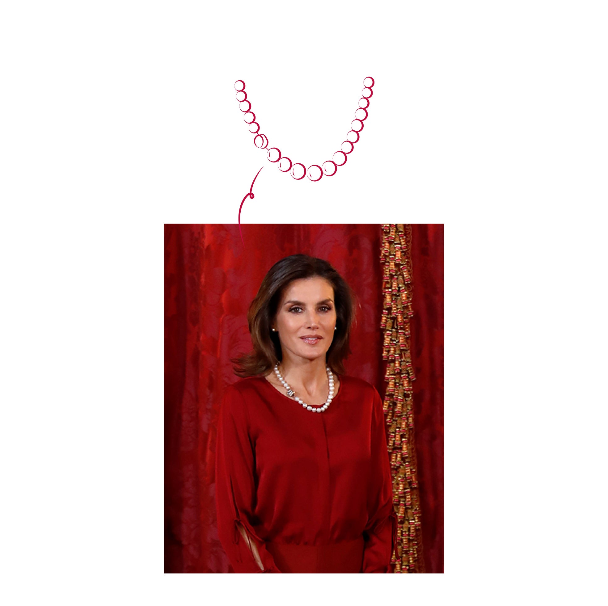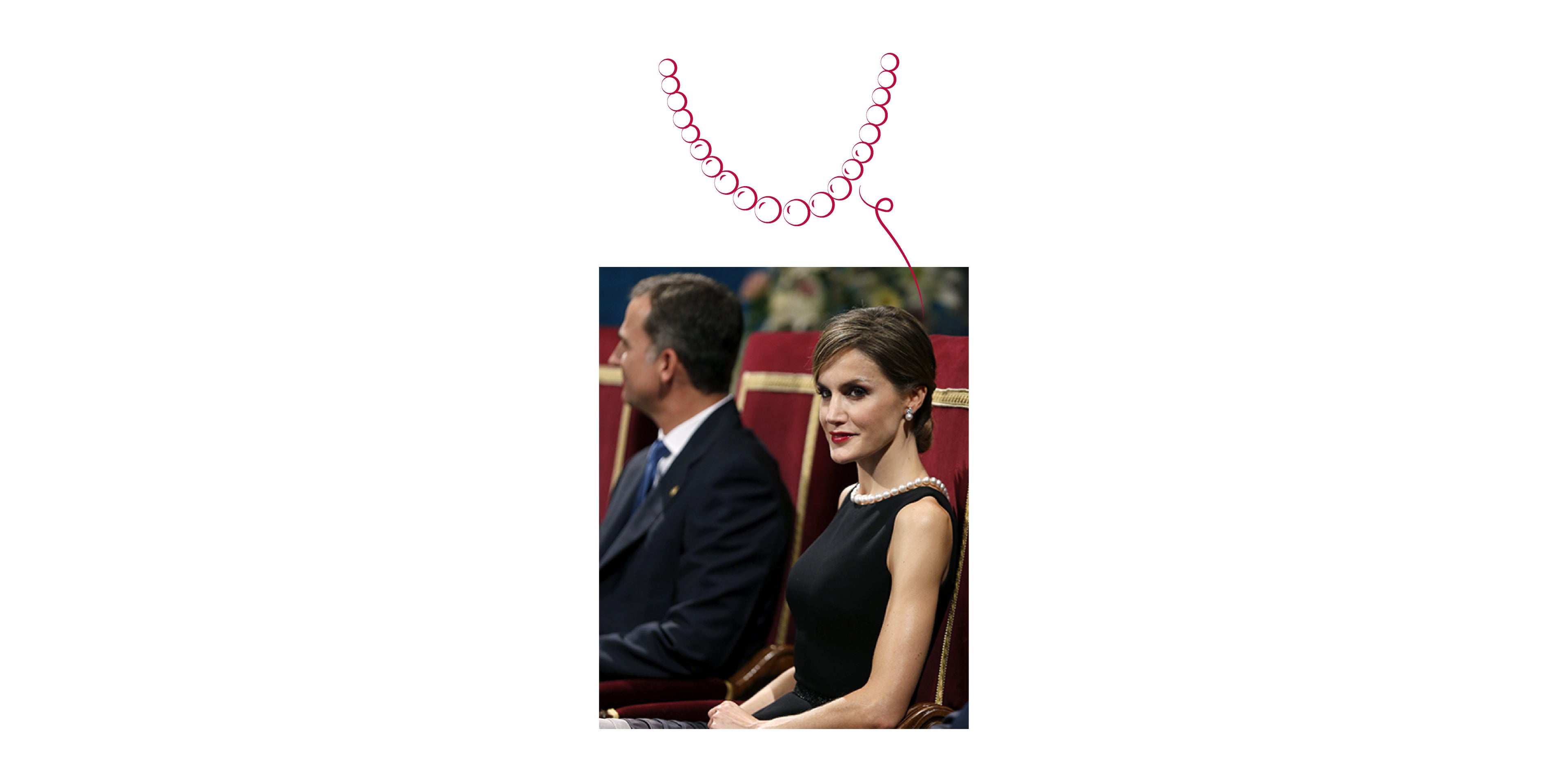Fue la primera pieza de las 'joyas de pasar' que usó doña Letizia. Se lo puso en 2015, en la ceremonia de los Premios Princesa de Asturias. Victoria Eugenia heredó este collar, que está considerada la joya más valiosa de Palacio, de su suegra, María Cristina. Alfonso XII no lo había comprado para ella, sino para su primera esposa, la reina Mercedes. El original tenía 41 perlas. Luego se aligeró y el actual tiene 37.