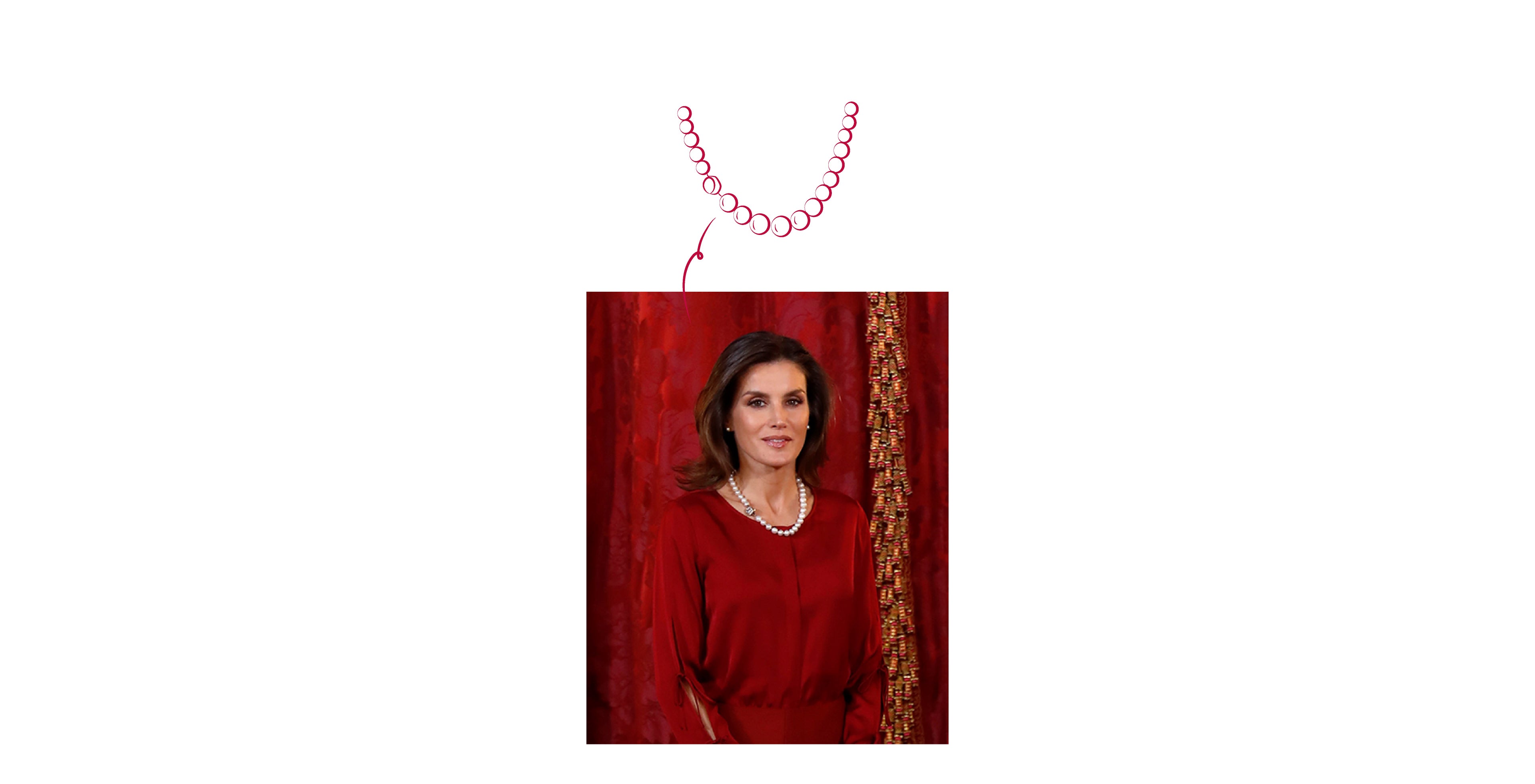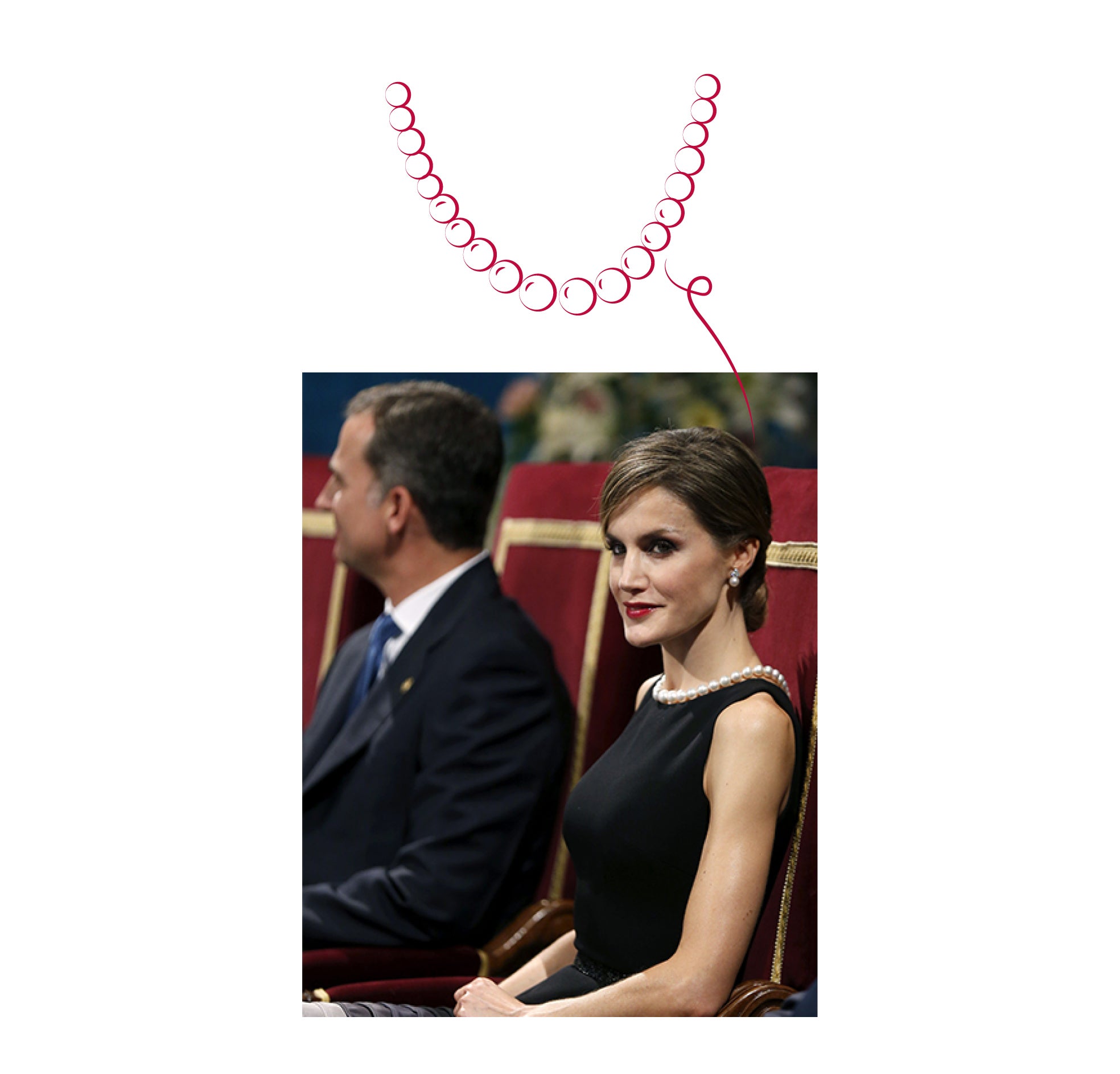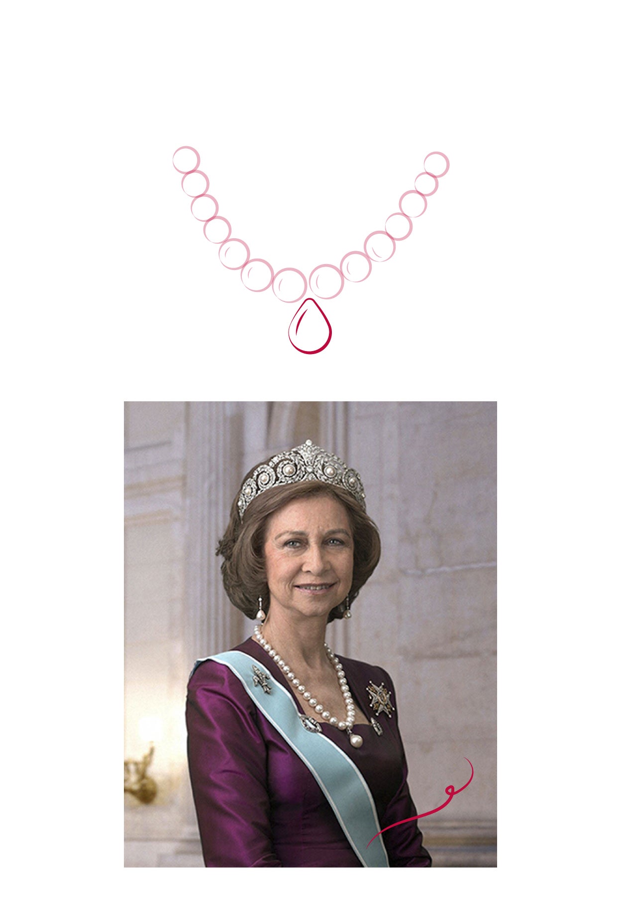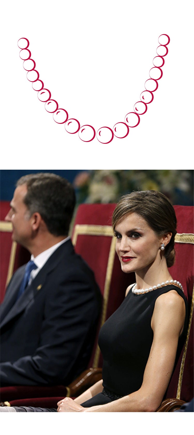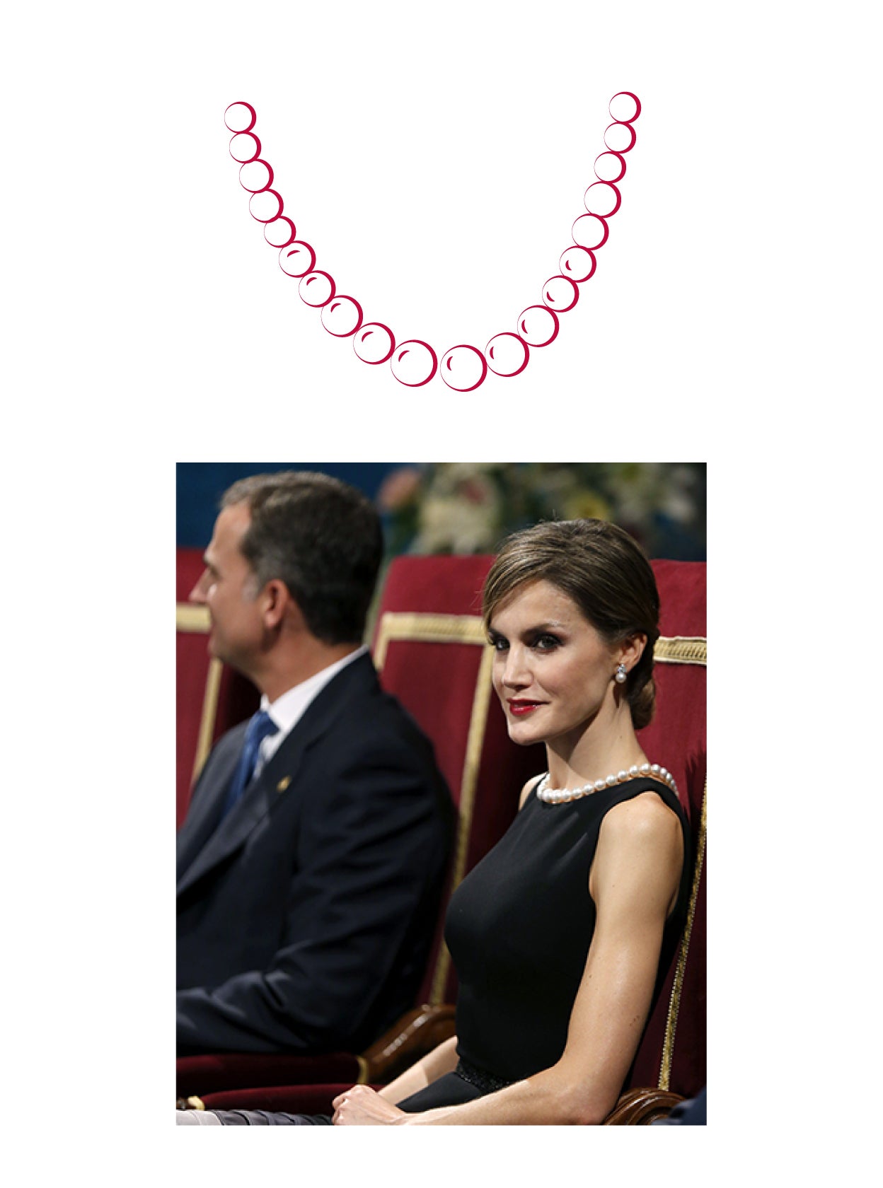 Fue la primera pieza de las 'joyas de pasar' que usó doña Letizia. Se lo puso en 2015, en la ceremonia de los Premios Princesa de Asturias. Victoria Eugenia heredó este collar, que está considerada la joya más valiosa de Palacio, de su suegra, María Cristina. Alfonso XII no lo había comprado para ella, sino para su primera esposa, la reina Mercedes. El original tenía 41 perlas. Luego se aligeró y el actual tiene 37.