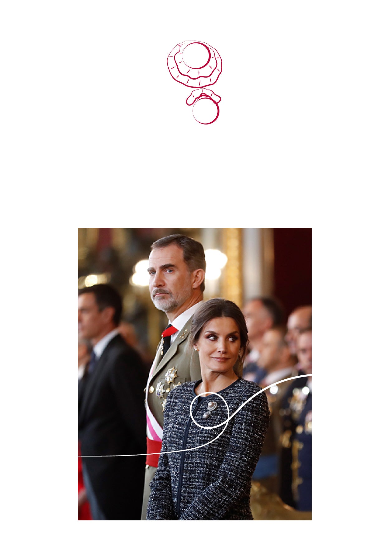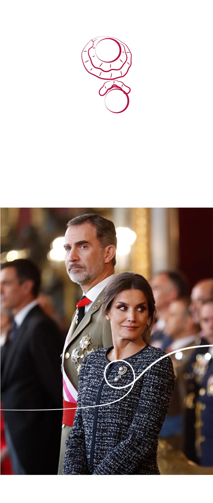 La perla que pende del broche se confunde algunas veces con 'La Peregrina', pese a que su tamaño y color son distintos. Lo 'estrenó' Letizia en la Pascula Militar de 2019. Este pasado enero, en el mismo acto, protagonizó una curiosa anécdota, ya que se le desprendió el broche en el patio de armas.