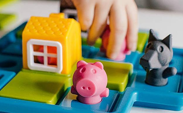 'Los tres cerditos' es un juego pensado para ello. No sigue las reglas del cuento. Aquí nadie sopla. Es más elaborado. Se trata de colocar en un tablero las casas, los cerdos y el lobo. Hay que hacerlo según el reto que plantea un libro de normas. El dibujo marca la posición de los animales y el niño tiene que colocar las casas, de distintas formas, en el tablero, de tal forma que encajen, que los cerdos queden dentro a refugio u el lobo fuera. «Las posibilidades de trabajar concetos no solo espaciales y lógicos sino éticos con los niños es enorme», destaca Cirarruista.