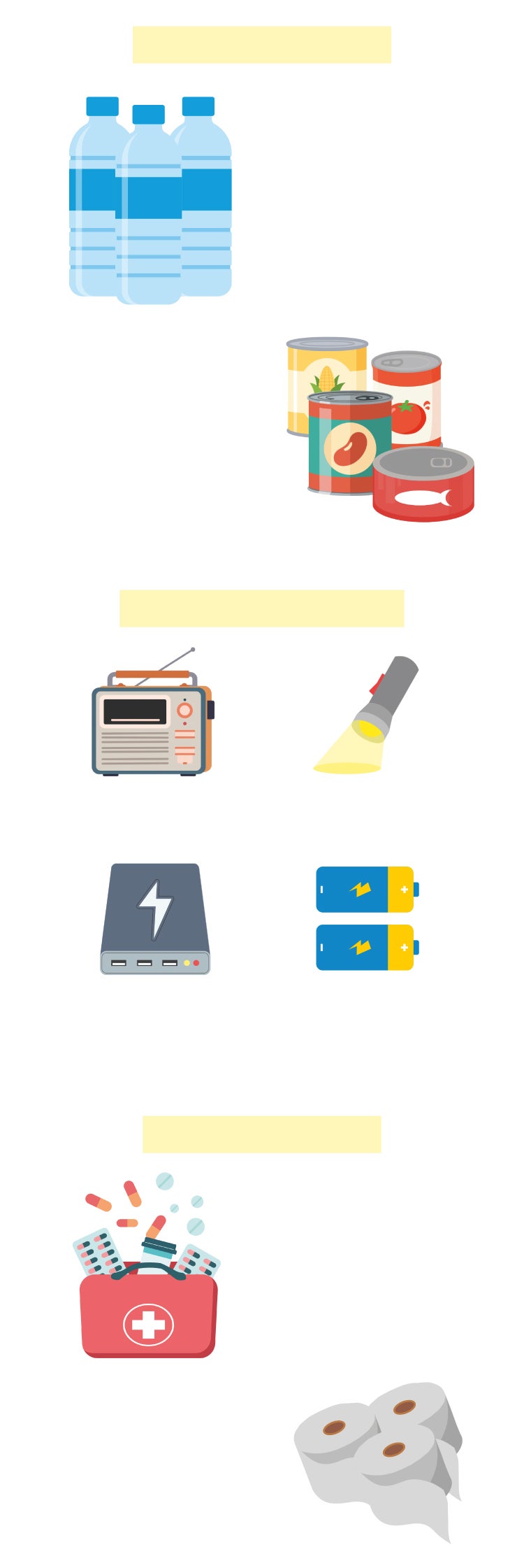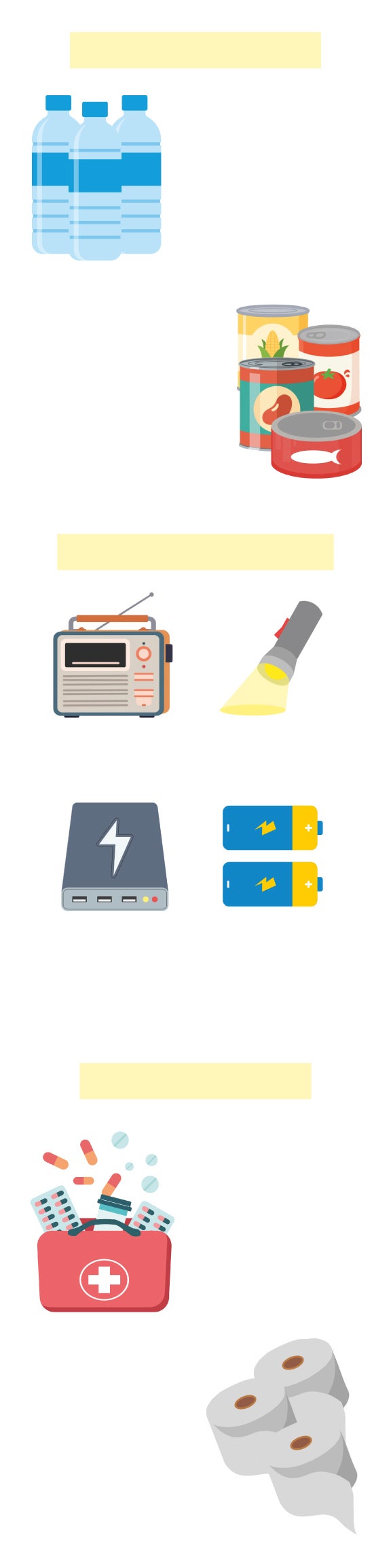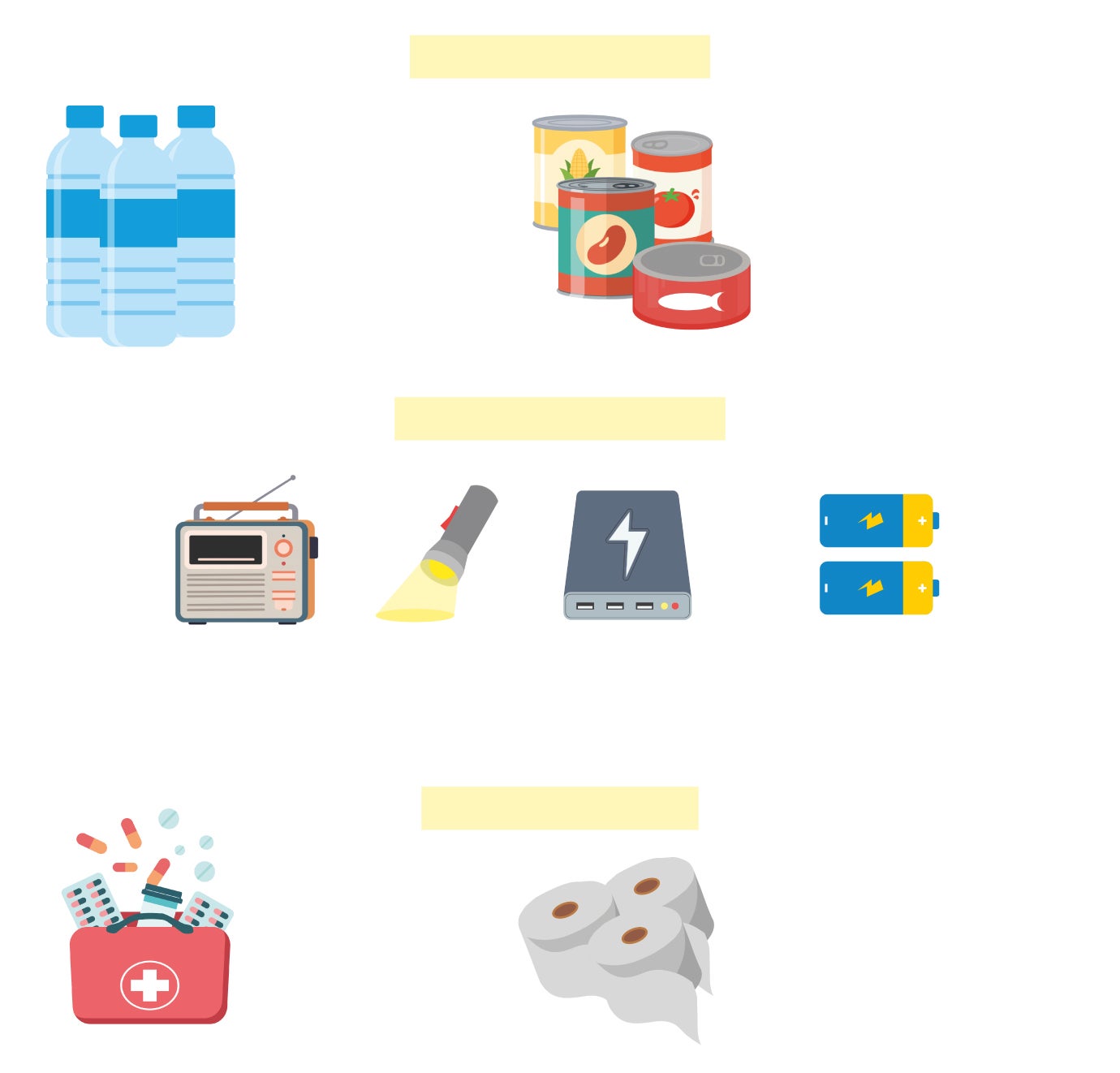 El kit de emergencia tendrá que estar compuesto de agua, comida, medicamentos e iluminación de repuesto para sobrevivir durante 72 horas sin ayuda