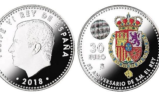 Esta es la segunda moneda que se ha realizado con motivo del 50 aniversario del Rey Felipe VI, ya que la FNMT ya anunció otra pieza de 30 euros acuñada en plata de ley que, desde hoy mismo, estará a disposición del público por un importe igual a su facial. La moneda de 30 euros, acuñada en plata de 925 milésimas y cobre, tendrá un diámetro de 33 milímetros y un peso de 18 gramos, y se emitirá durante el primer trimestre de 2018. En este caso, el número máximo de piezas que se acuñarán será de un millón, aunque esta cifra podrá elevarse o reducirse en función de la demanda.