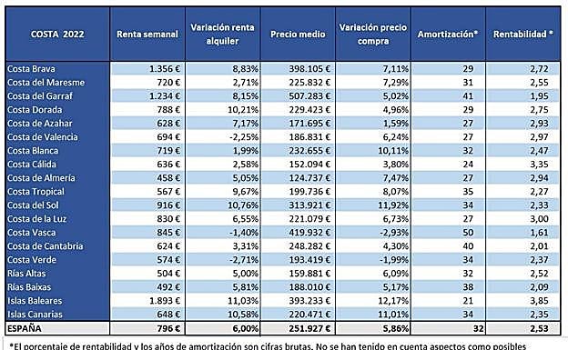 Respecto a la rentabilidad, la costa que más beneficios reporta a los propietarios es Baleares (3,85%), al igual que el año pasado. Costa Cálida (3,35%) y Costa de la Luz (3%) son las siguientes en rentabilidad. Respecto a las zonas donde menos se gana con el alquiler, Costa Vasca (1,61%), Costa del Garraf (1,95%) y Costa de Cantabria (2,01%) protagonizan el ranking.
