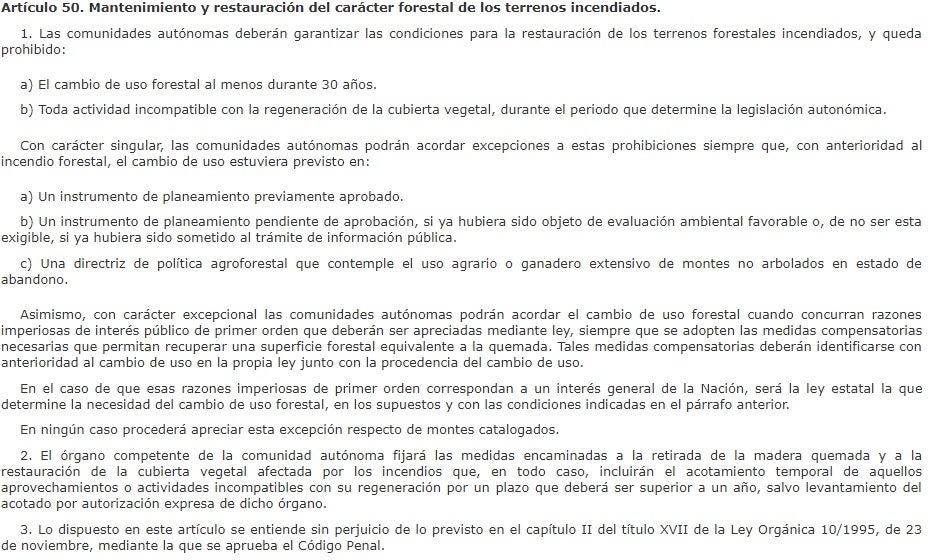 La ley gallega, aprobada en 2012, recoge que “en terrenos afectados por incendios forestales, no podrá producirse un cambio de uso en 30 años”. También contempla excepciones, pero solo para cambios “previamente aprobados” o en trámite de aprobación. Es decir, no haría falta provocar ningún incendio, ya que esta posible recalificación sería previa.