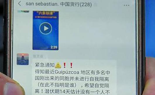 «Urgente. Nos comunican que varios de nuestros compatriotas chinos llegados a Gipuzkoa estos días no se han sometido a ningún periodo de aislamiento. Rogamos que, por favor, permanezcáis 14 días en cuarentena en casa para evitar fatales consecuencias».