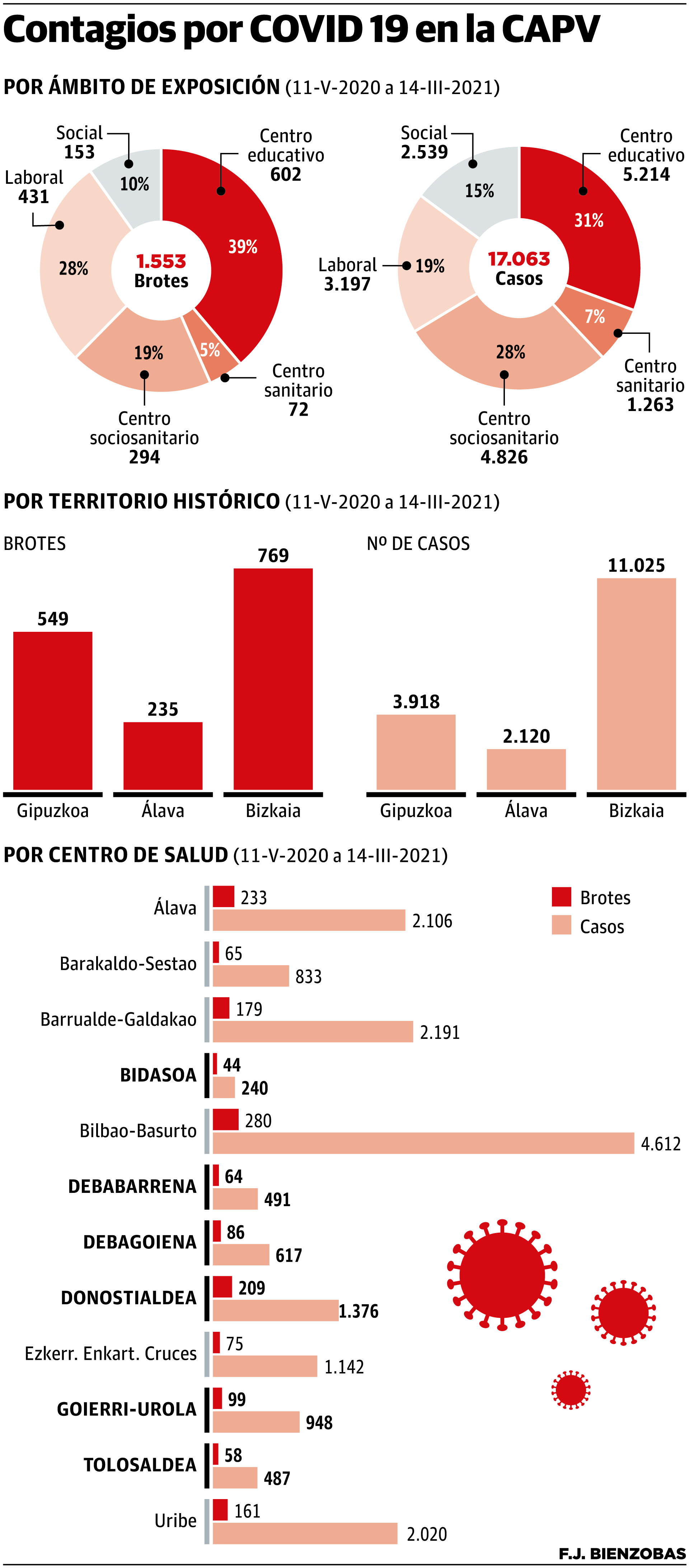 Salvo para el ocio nocturno, que sigue clausurado, en Euskadi los cierres totales de la actividad decretados cuando el virus arreciaba en los diferentes municipios, cesaron el pasado febrero cuando el Tribunal Superior de Justicia del País Vasco ordenó la reapertura cautelar de bares y restaurantes, que se sentían especialmente perjudicados y «estigmatizados». Sin embargo, solo el 2,38% de los brotes de coronavirus surgidos fuera del ámbito domiciliario hasta la pasada primavera se registraron en establecimientos de ocio. Por el contrario, dos de cada tres focos de contagio detectados en Euskadi (67%) se dan entre el ámbito educativo (39%) y el laboral (28%), según un informe del Departamento vasco de Salud.