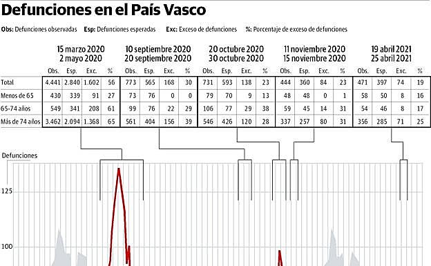 Desde que comenzó la pandemia, los periodos con una mortalidad «excesiva» han coincidido con la irrupción del coronavirus y la fase de confinamiento (entre marzo y mayo de 2020), y con las sucesivas olas que han ido apareciendo. En el caso de Euskadi, en cambio, esa circunstancia no se dio durante la tercera ola, entre enero y febrero, pero sí ha vuelto a producirse con la cuarta. La semana pasada, entre el 19 y 25 de abril, se contabilizaron en Euskadi un total de 471 fallecimientos, 74 más (un 19%) que los esperados en circunstancias normales. El exceso es mayor entre los mayores de 74 años (25%) y baja al 17% entre la población de entre 65 y 74, y al 16% entre los menores de 65.