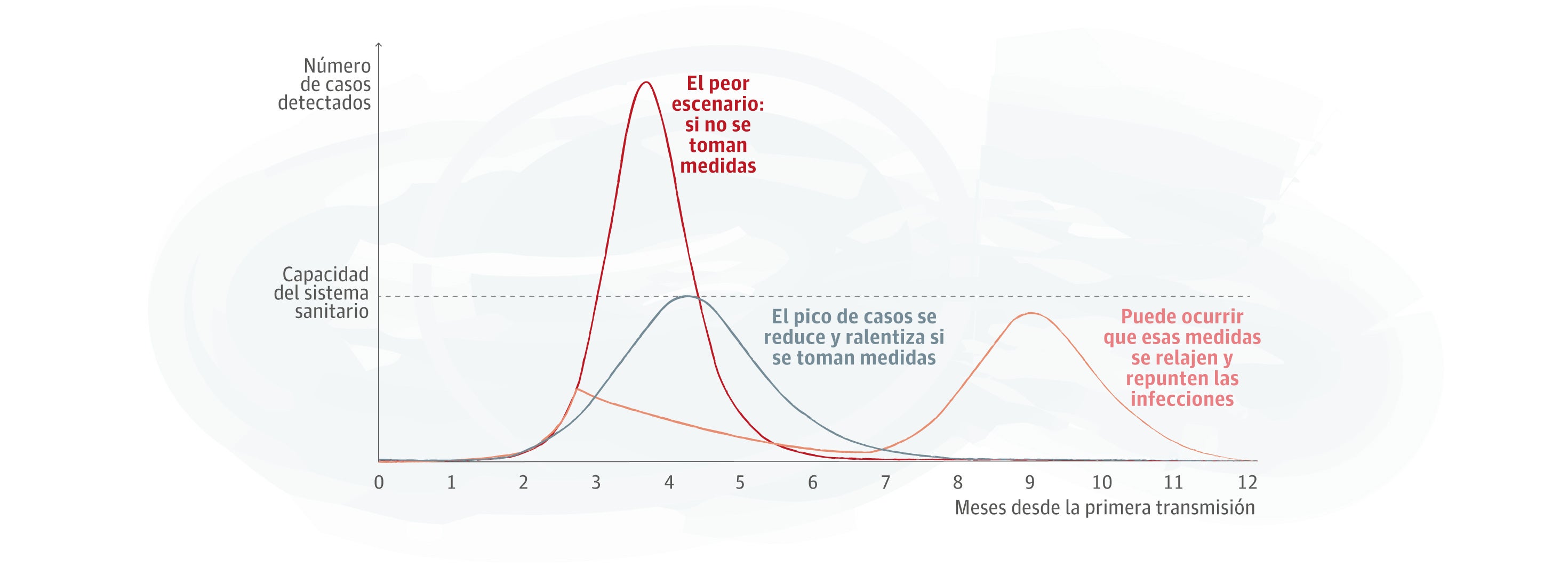 365 casos diagnosticados y 5 muertos en España. Son 98.700 contagiados en el mundo y 3.400 muertos. La revista científica The Lancet publica un análisis en el que se muestran tres posibles escenarios de la epidemia. Es una curva de casos y el objetivo es aplanarla para que no se colapse la capacidad del sistema sanitario. La cuarentena, el distanciamiento social y el aislamiento de las poblaciones infectadas, medidas que se han tomado en China, resultan efectivas.