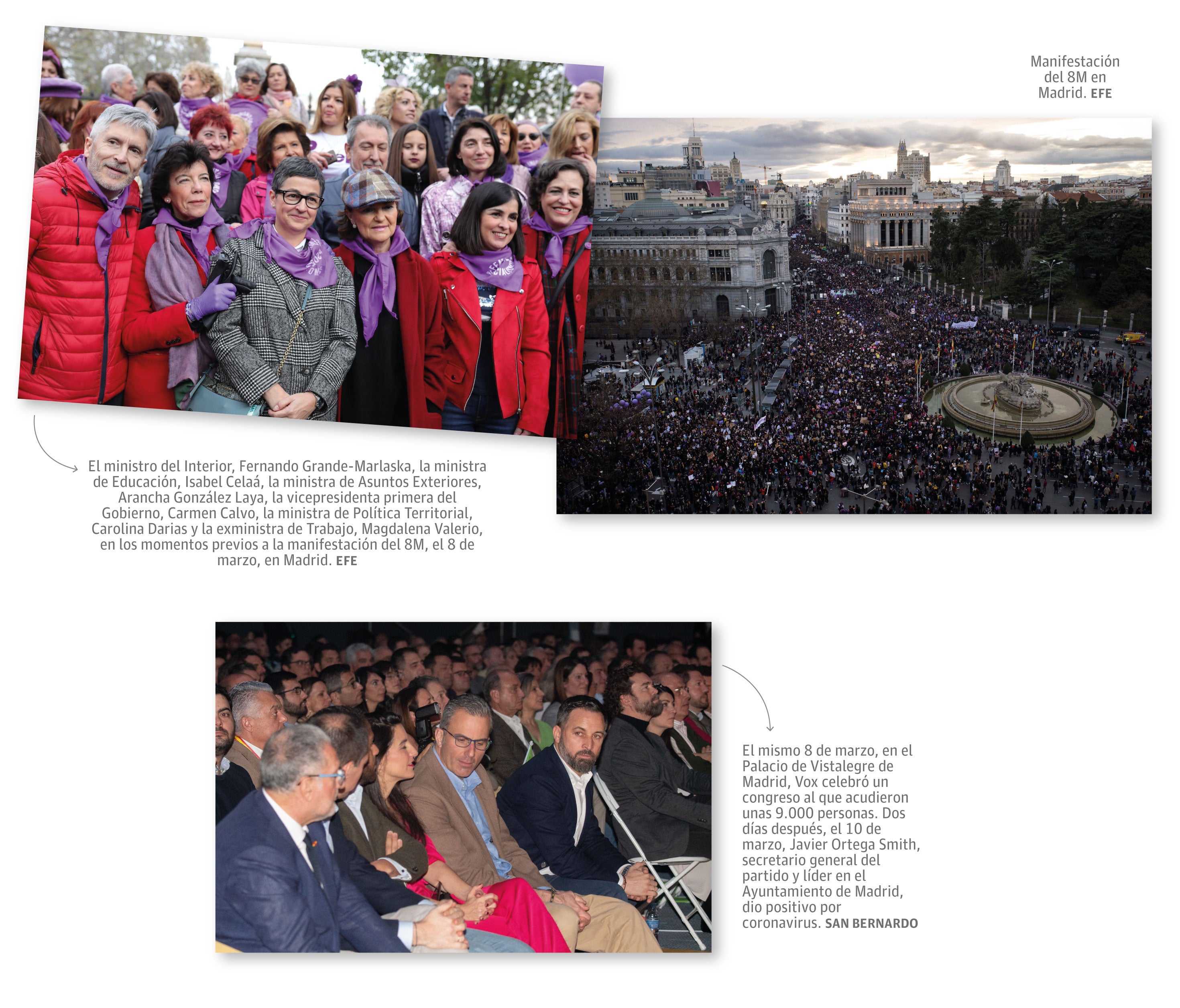 Hay 674 casos diagnosticados y 17 muertos en España. Se celebra el 8M, con menor afluencia que el año anterior, pero con miles de personas en las calles. Son 120.000 en Madrid. El resto de eventos, como los deportivos, se celebran también con normalidad.
